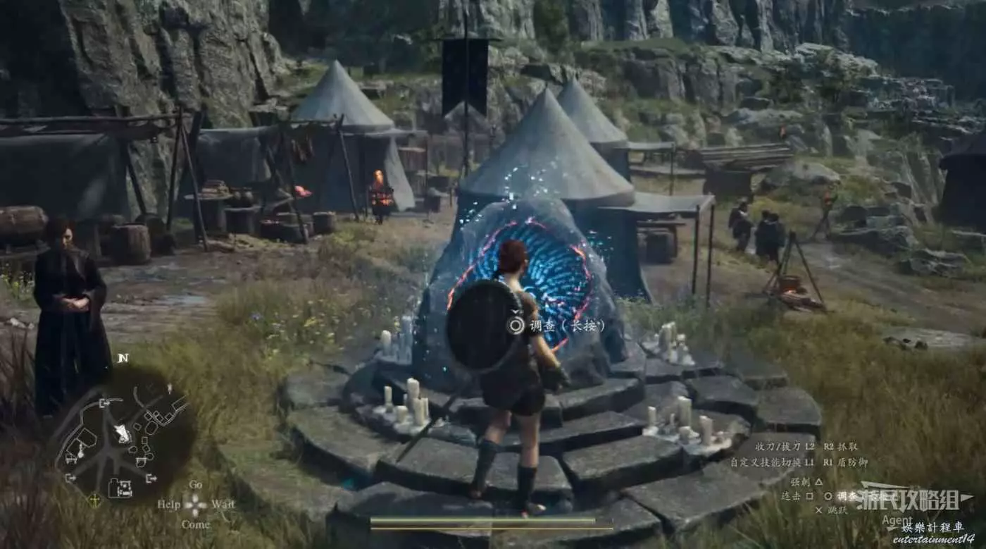 下圖位置遇到教官布連,接到支線任務“獸人教官”。帳篷旁還有個遺忘異界石,觸摸即可啟動。