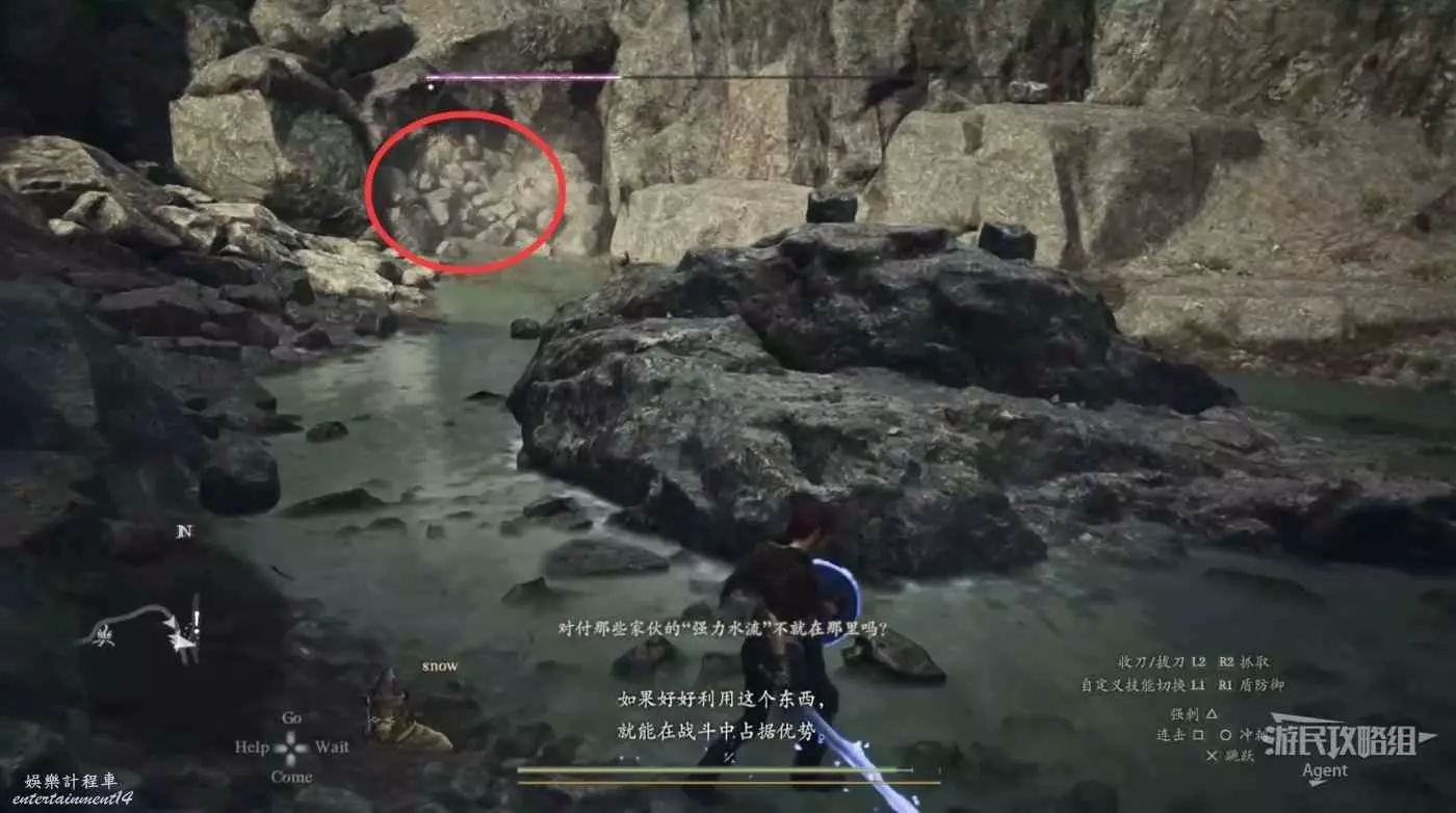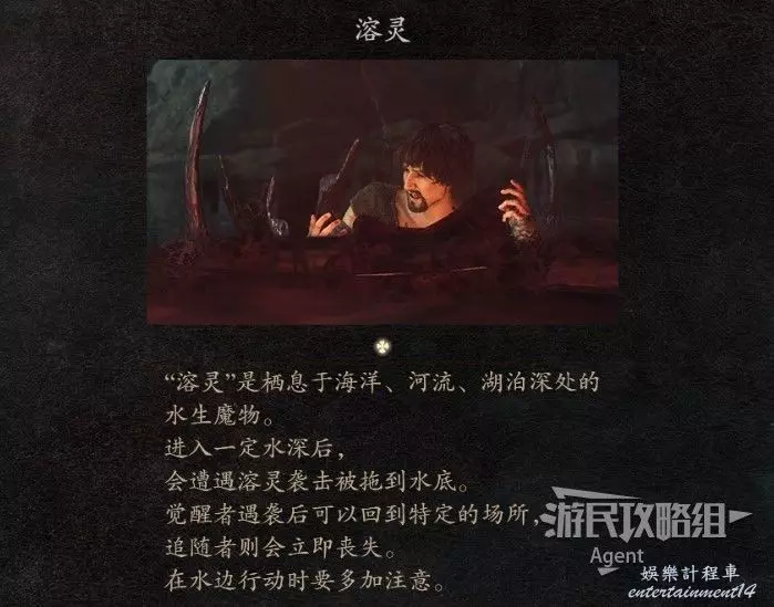 從獅鷲上掉下來後,身邊有水。靠近水時注意,如果到水過深的地方,會被水裡的魔物“溶靈”吞噬。