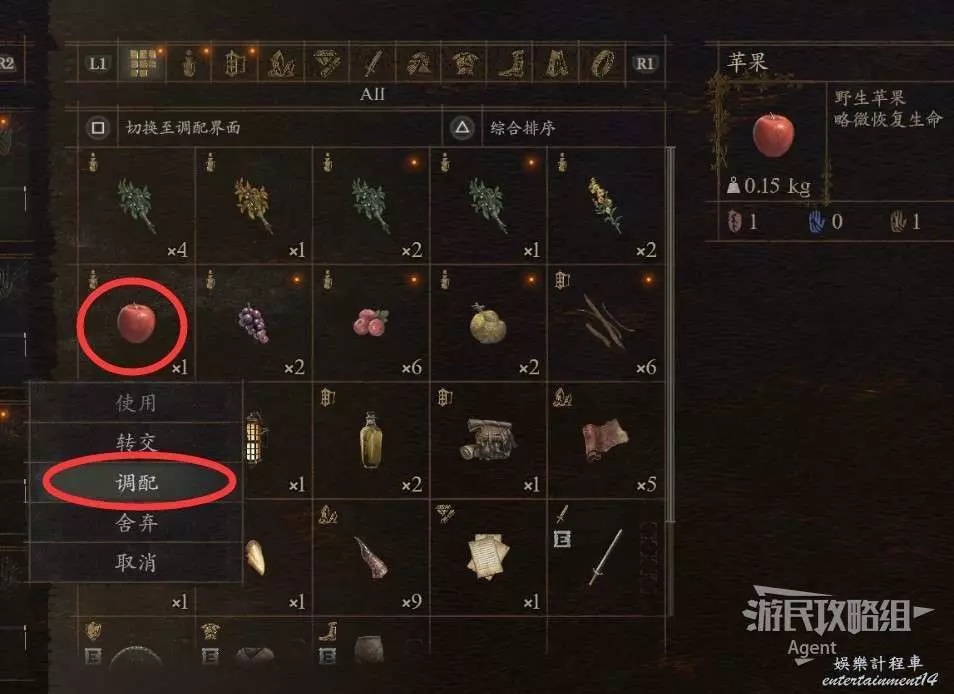 在物品欄選中一項物品,可以看到“調配”菜單。