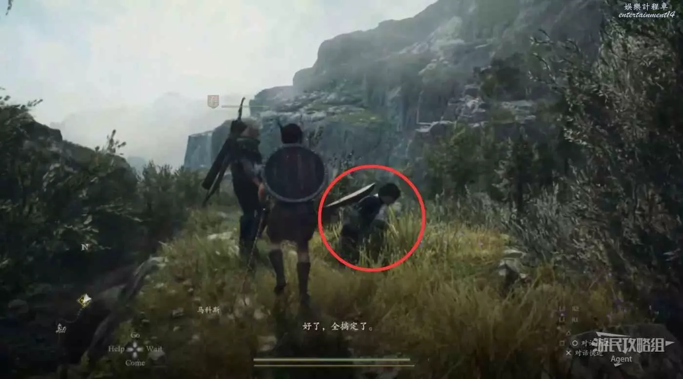 到營地北面,遊戲一開始剛從獅鷲身上掉下來時路過的地方,找到馬科斯,把筆記交給他。