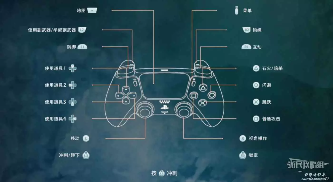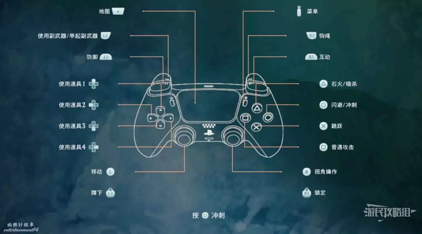 4、右側上下兩個方框是武器欄,上方框是主要武器,下方框為副武器,角色可以同時裝備兩把主武器與兩把副武器,在戰鬥中按下R1與十字鍵上、下切換。角色還能同時裝備三種流派,也是通過R1與左搖杆來切換流派選擇。而左下角的三角鍵與方框鍵是角色可以使用的技能。