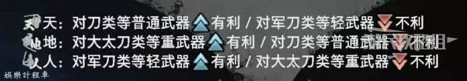 上圖的天、地、人可以看做是流派的屬性,這隻影響到對某些武器的克制效果,所以建議每把武器都裝備3種不同屬性的流派,以應對戰鬥中的各種突發情況。