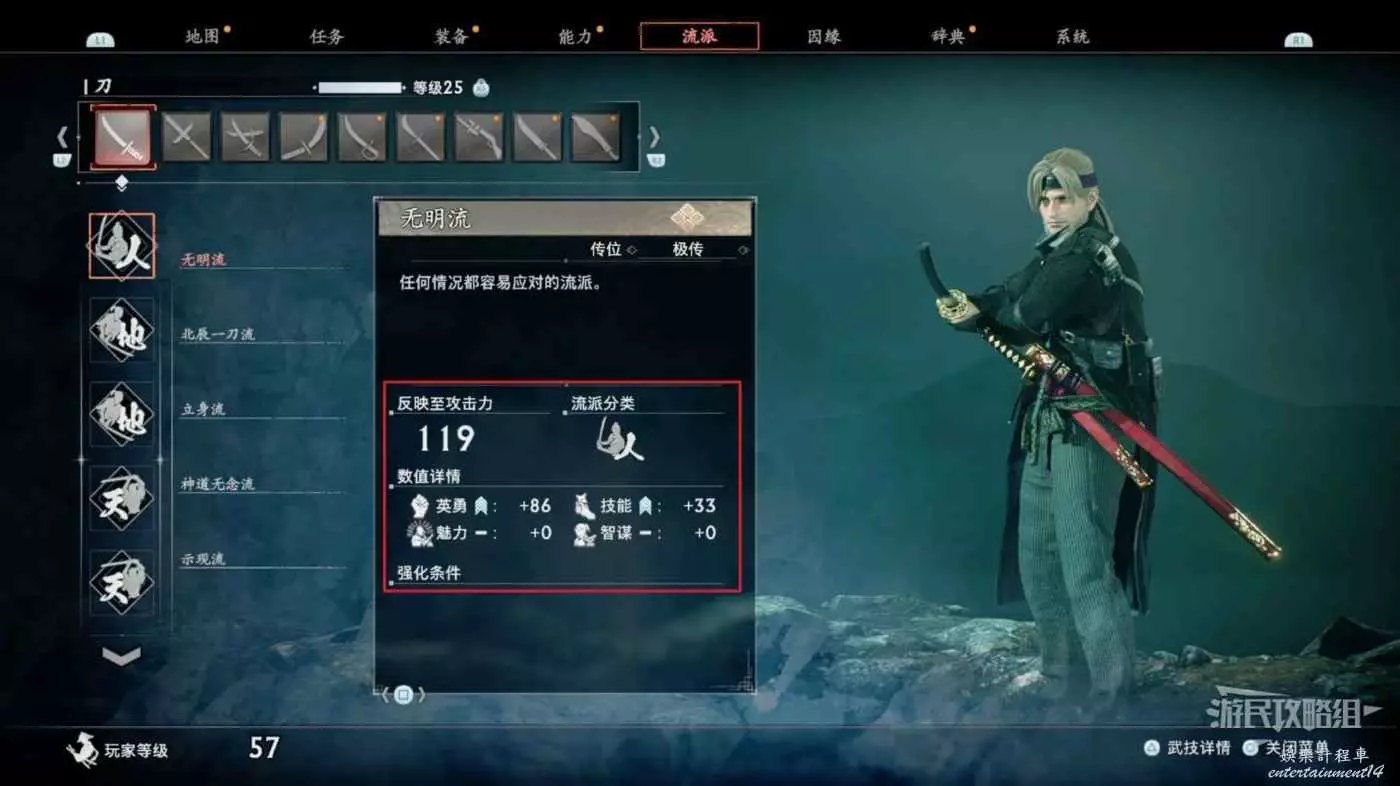 流派一共有4個等級,每提升一次等級都會帶來不等的增益,當某個流派提升到高等級時,有些武技會成為奧義並得到強化。