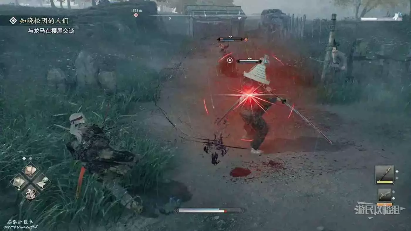 敵人精力值被打空時會陷入恐慌狀態,此時按下三角箭即可打出追加攻擊來處決敵人,所以戰鬥中注意自己的精力值並觀察敵人的精力值,熟練使用石火是關鍵。