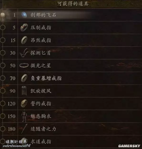 龍族教義 2 (Dragon’s Dogma 2) 探求心之證可兌換道具一覽 22 3 月 2024-03-22 廣告 作者:Agent 來源:遊民星空 1——刹那的飛石,用於從外地傳送回城市。 5——壓制戒指,攻擊容易使敵人踉蹌或被擊飛。 15——昂然戒指,增加生命值、體力值、負重上限。 30——探測匕首 50——微光之星 70——負重暴增戒指,增加負重上限。 90——凱旋披風 120——誓約戒指,戴上容易增加好感度。 150——魅惑胸衣 180——追隨者之力,追隨者裝備時可自己復活。 220——求道戒指,打怪時少量提升職業點數獲得量。