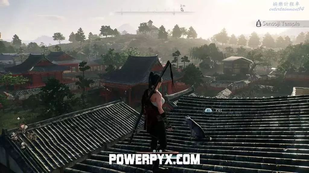 在寺院屋頂上。需要先爬上附近的塔然後利用滑翔翼飛過去。