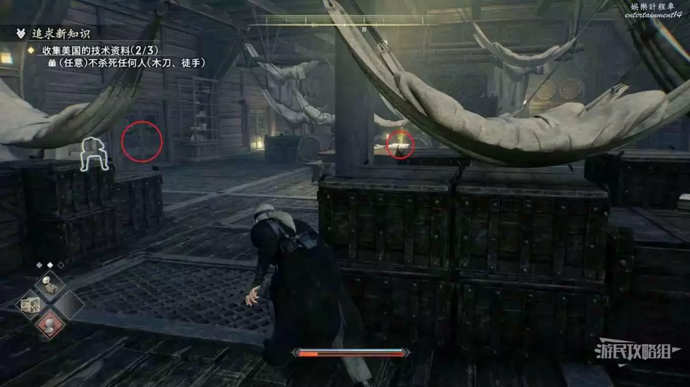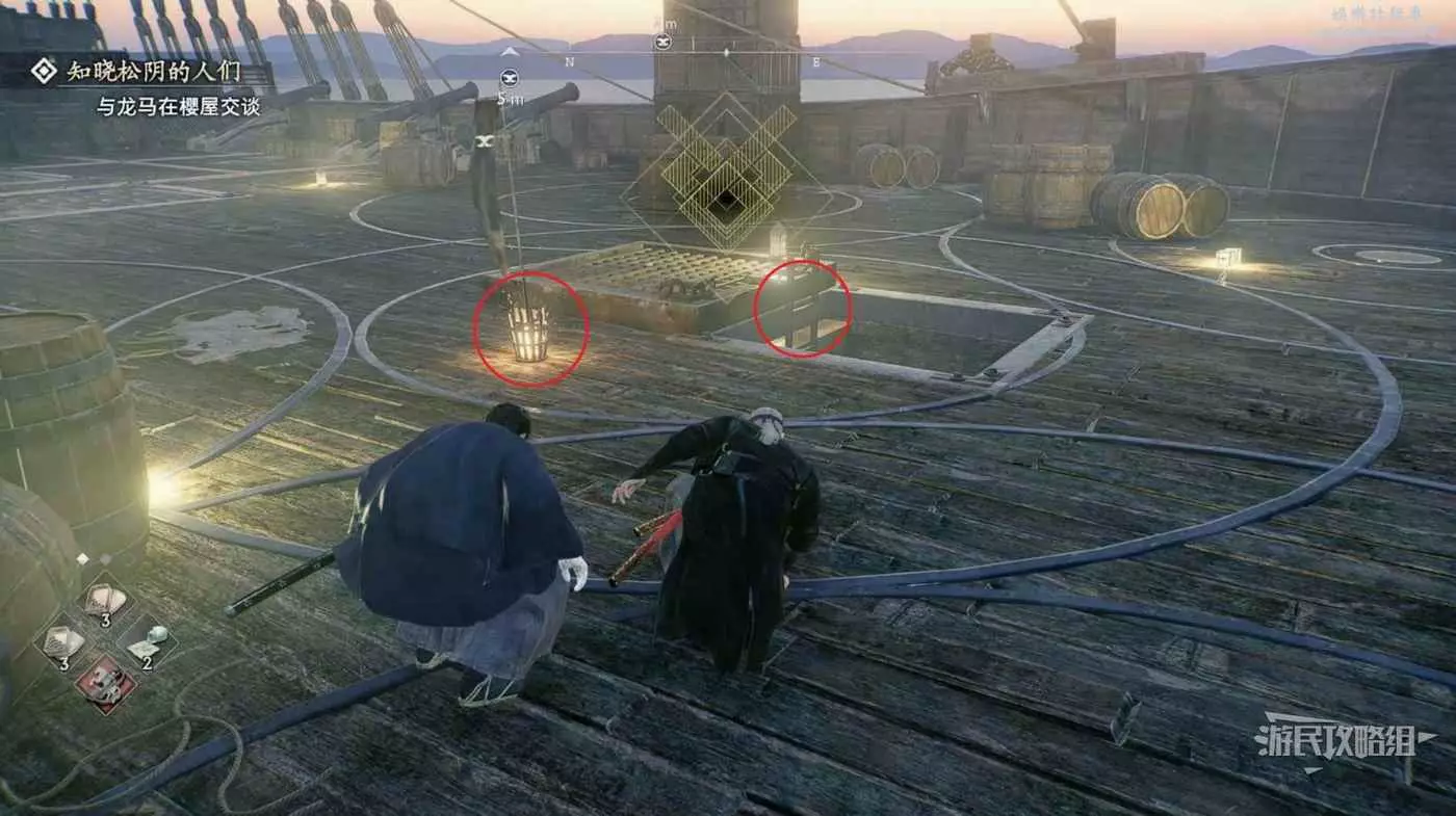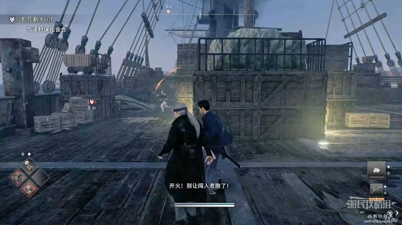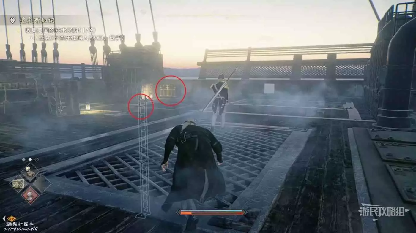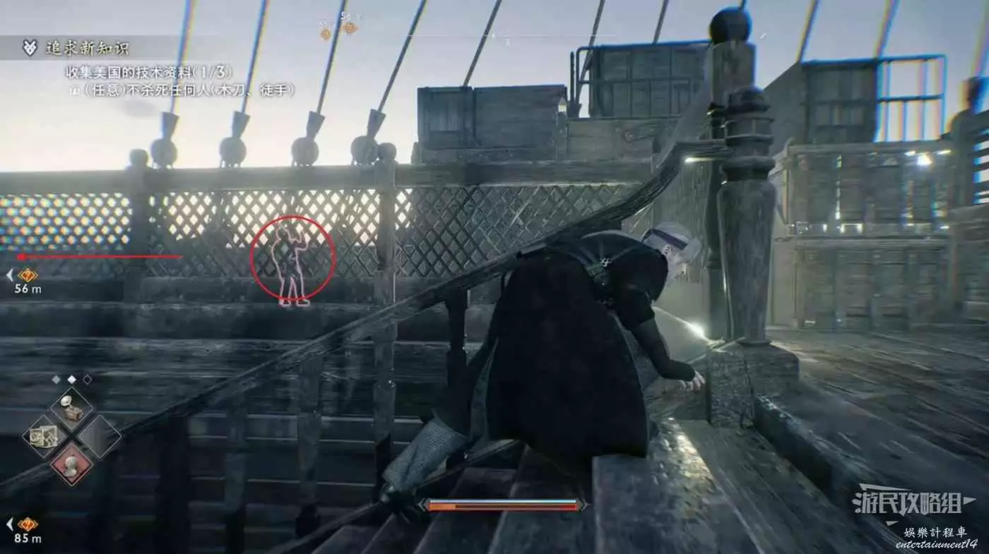 來到甲板先往左看,暗殺掉左側的看海士兵並往左走。
