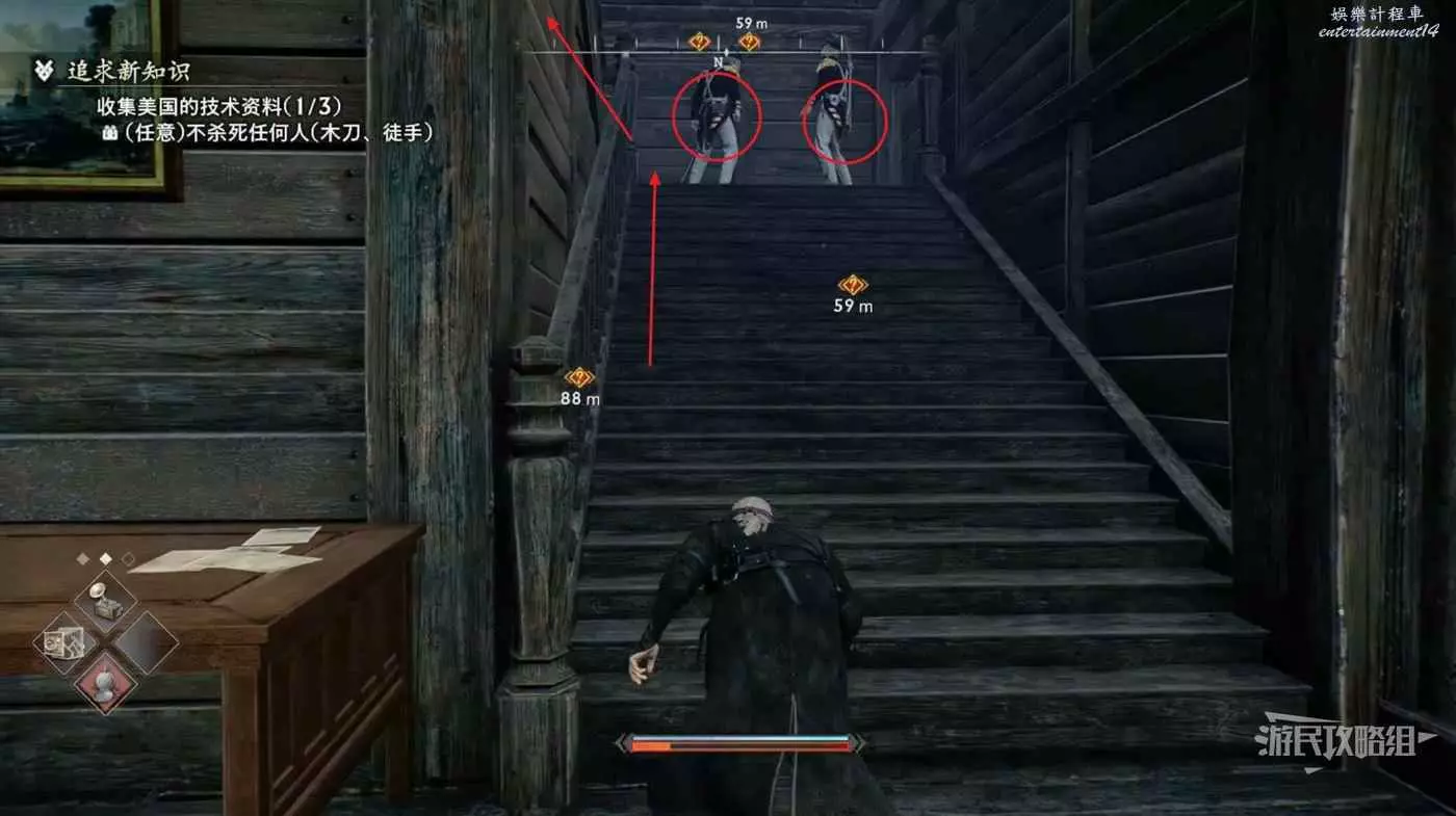 回到第一個走廊暗殺這兩個交談的士兵沿著樓梯往甲板上走。