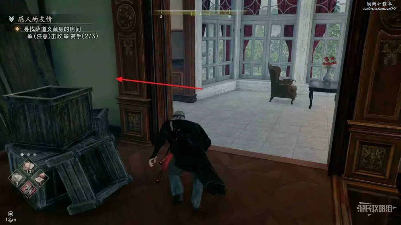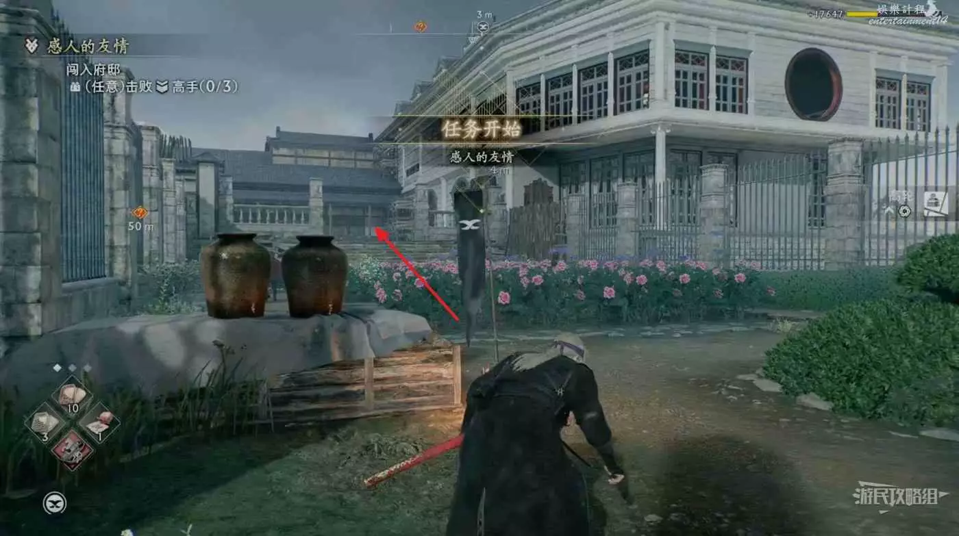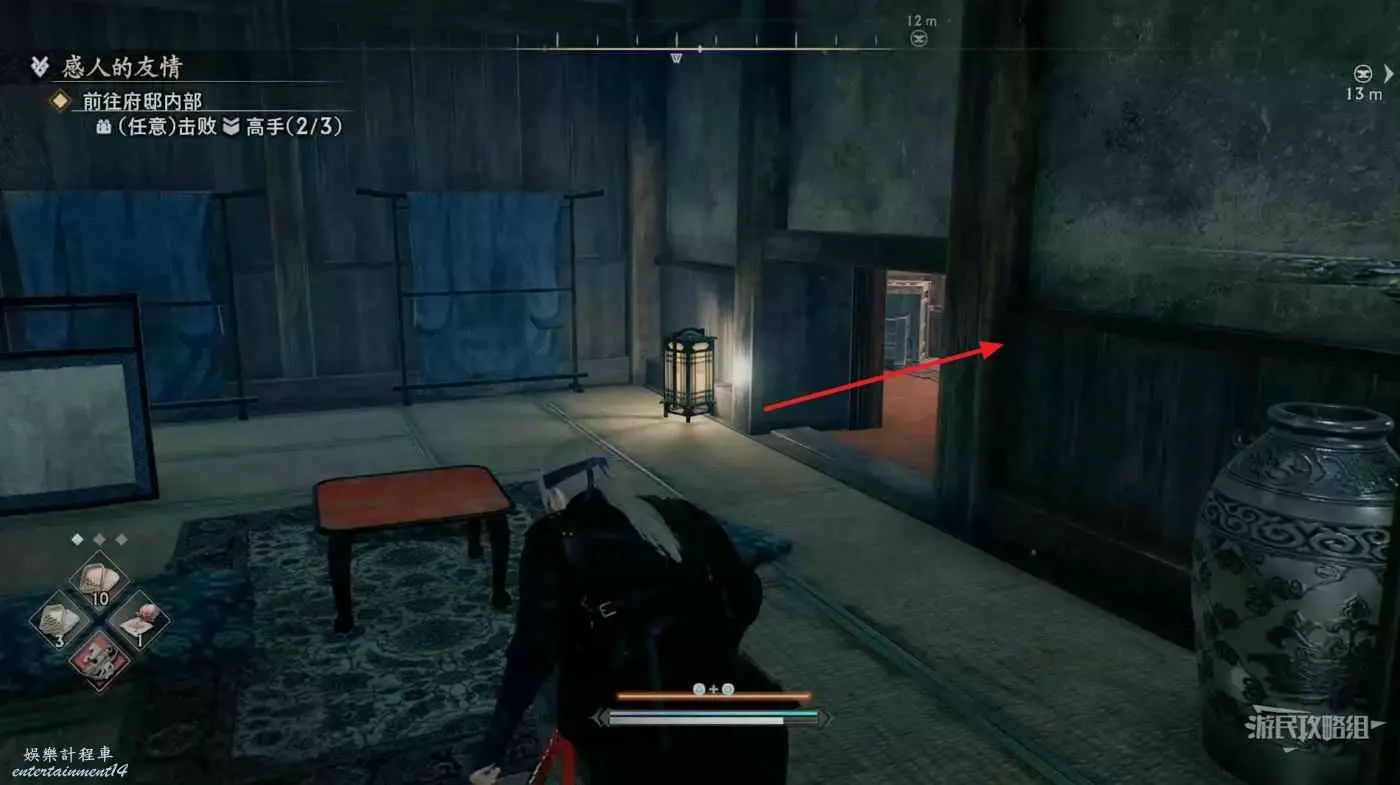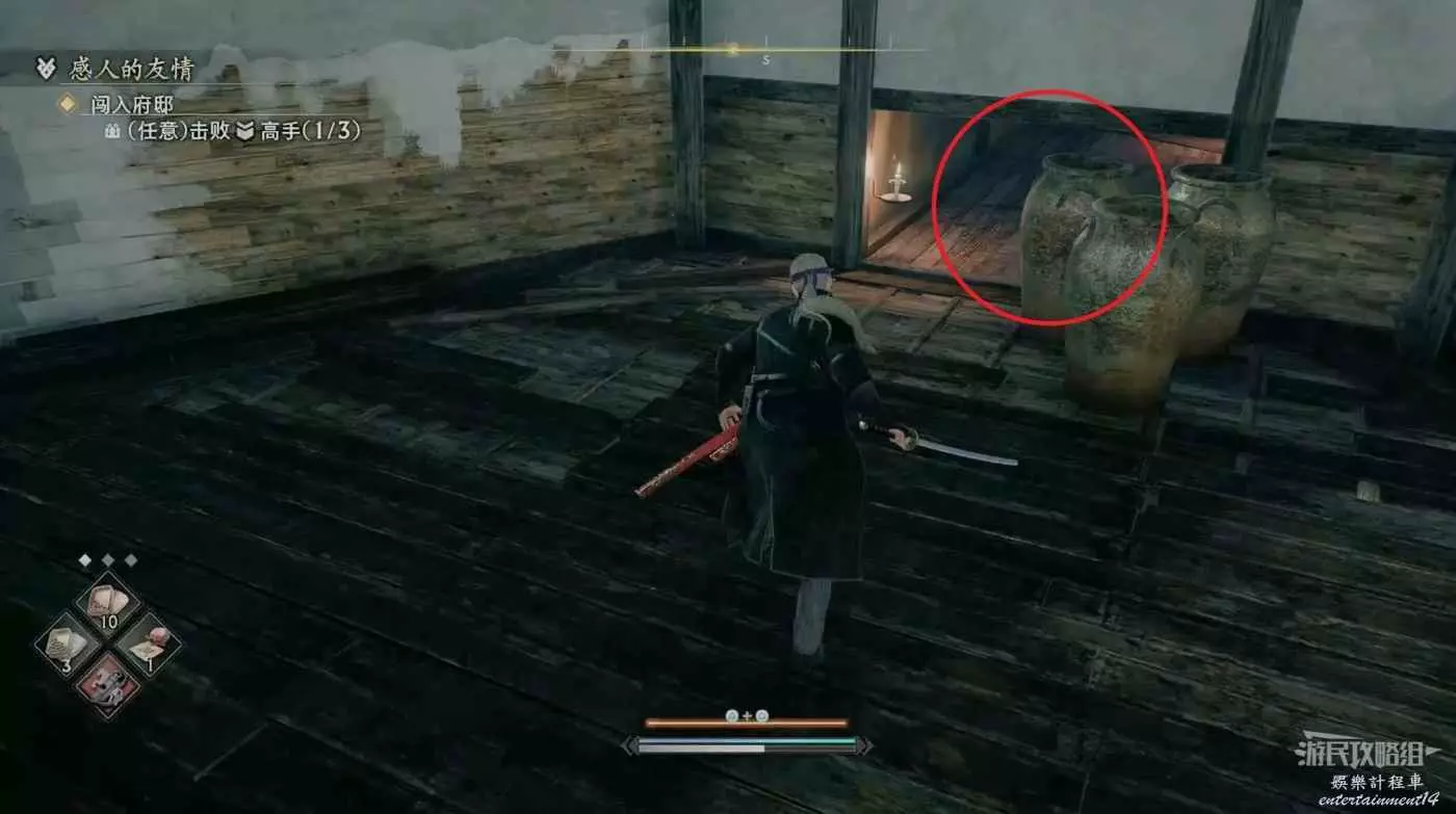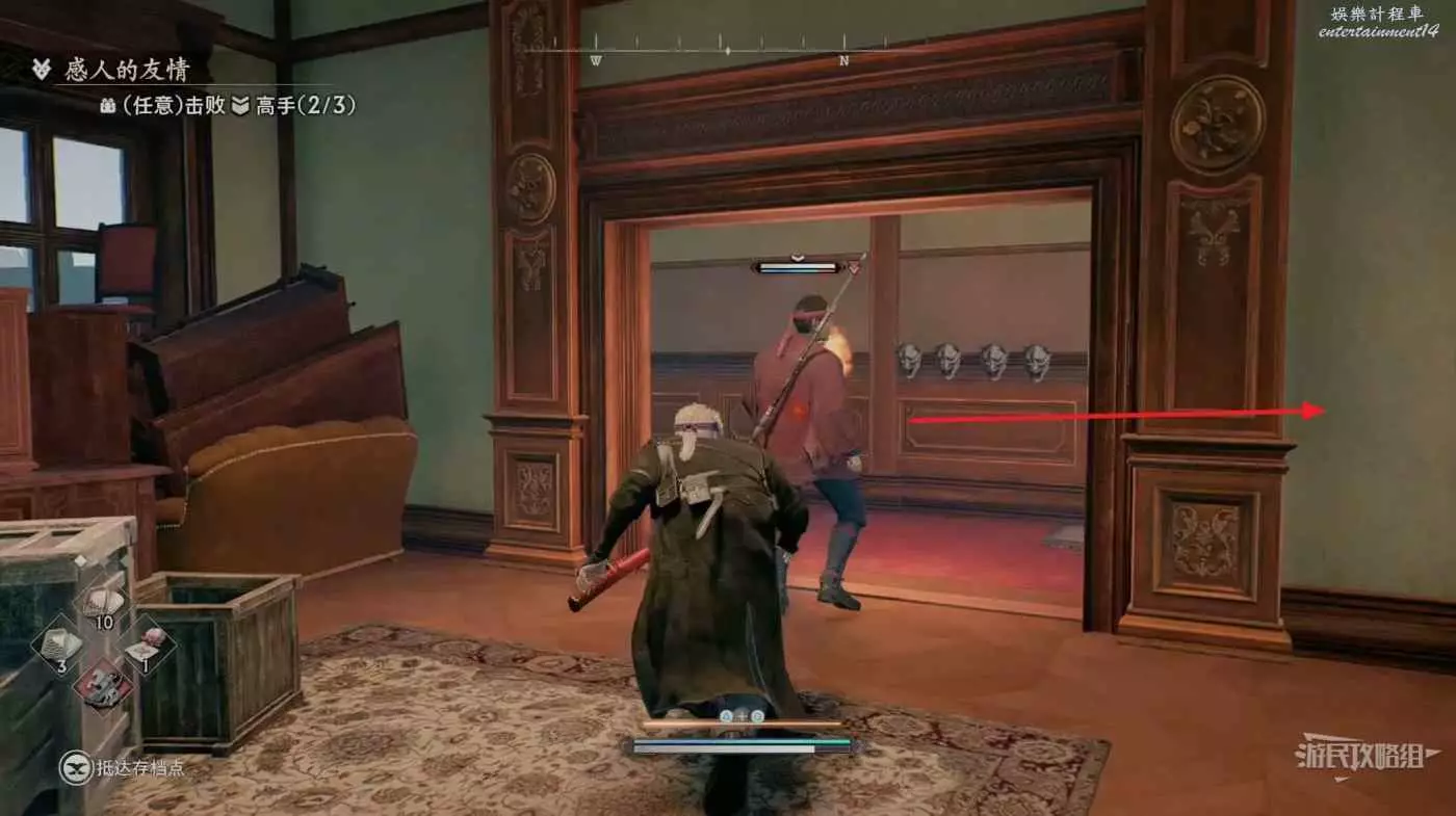 先走到敵人後面將其暗殺掉,注意敵人的身後有一個陷阱。