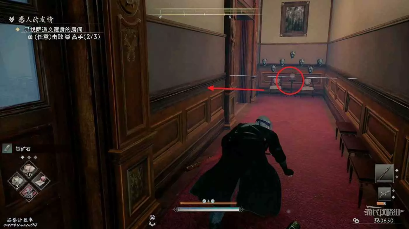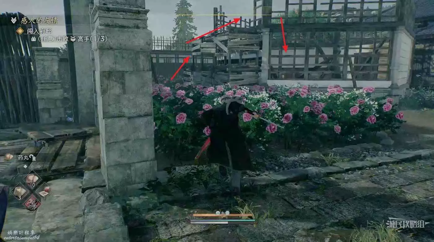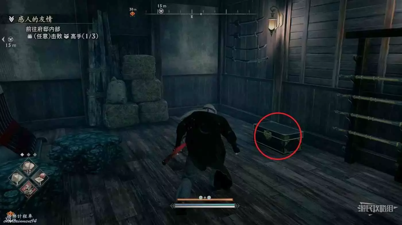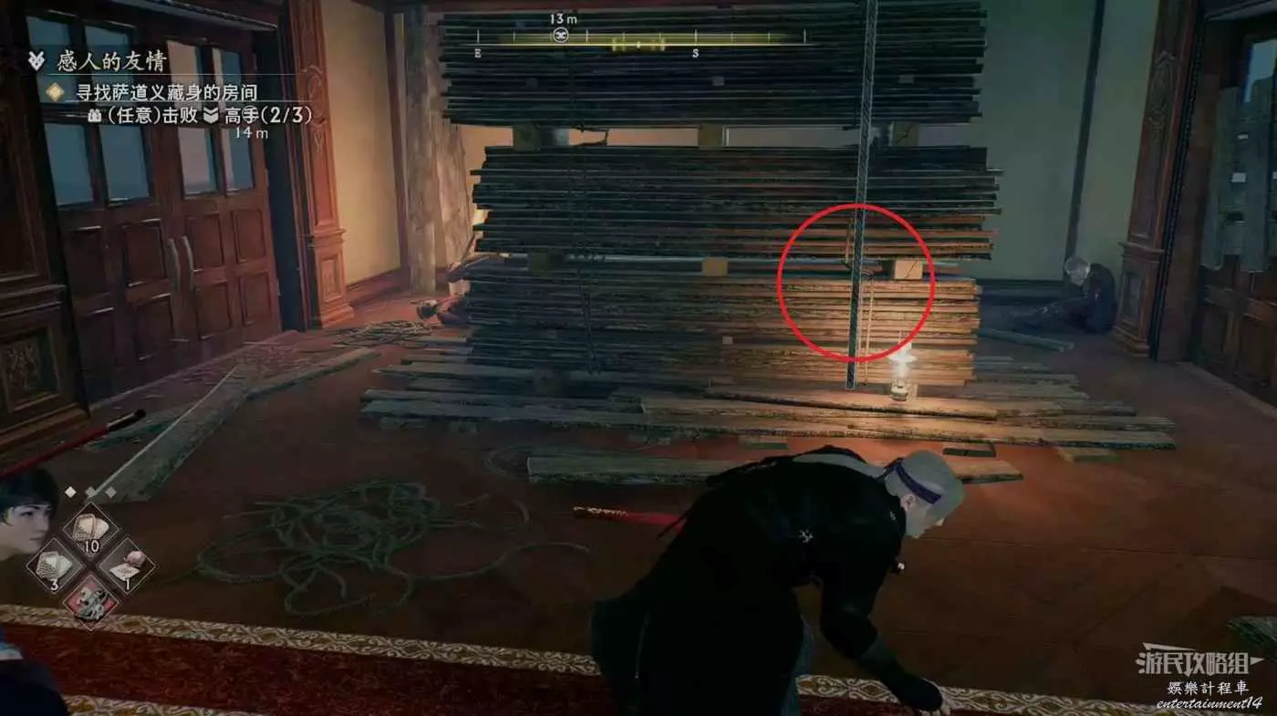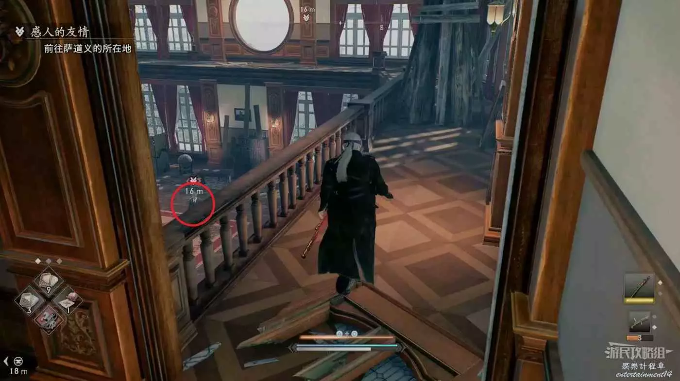 先走到敵人後面將其暗殺掉,注意敵人的身後有一個陷阱。