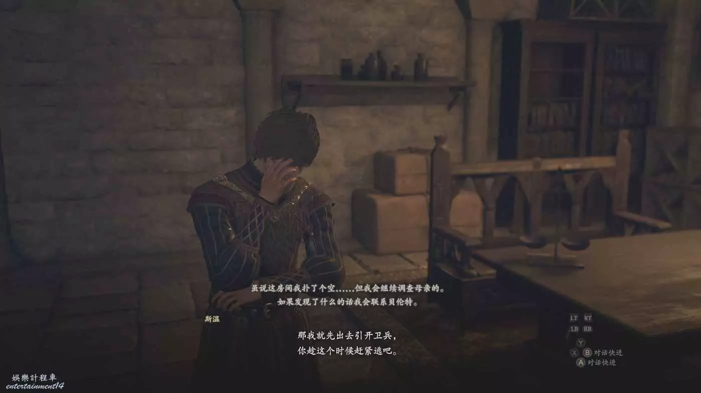 4.進入二樓後找到執務室,進去的桌子上有醜聞的一角,碰到了斯溫(這裡我做了斯溫的前置任務,所以我們正常對話即可),斯溫會幫我們牽制外來的衛兵,拿到後先別急著出去,等門外衛兵npc的聲音走遠後,再出來,千萬別回頭去看那兩個衛兵,會直接觸發通緝,直接偷溜去酒館報告一下任務,筆者這裡以為穿著衛兵裝沒事,回頭去看了兩個跟著斯溫的衛兵,結果依然觸發了通緝,被毆打入獄。