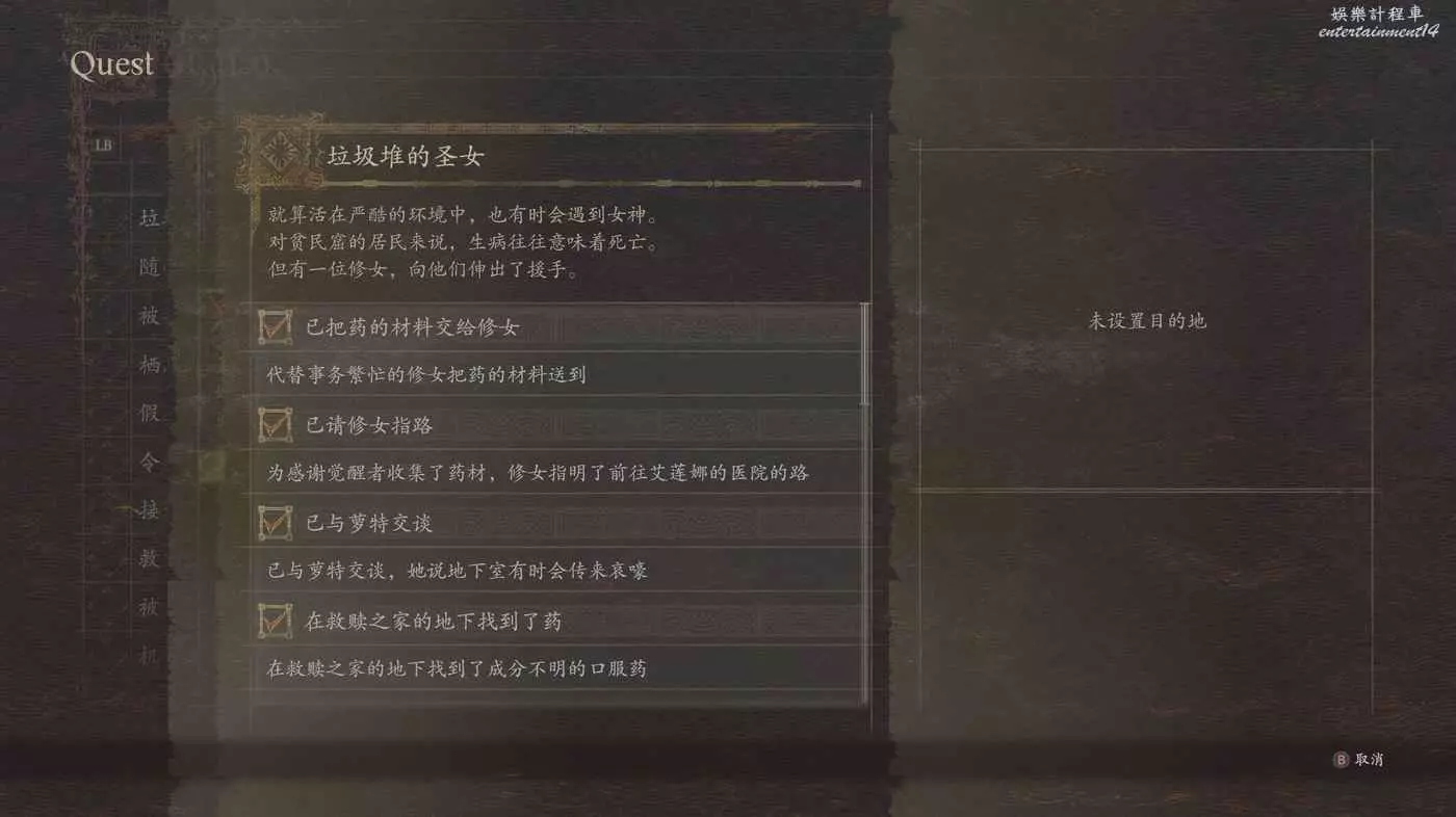 1.在救贖之家門口與修女長談話,得知需要三塊瘴氣石做藥,瘴氣石晚上擊殺城鎮附近的幽靈獲得,大地圖上有標註,臉黑的話可以多刷幾個晚上,筆者刷了兩個晚上才湊齊三塊石頭。