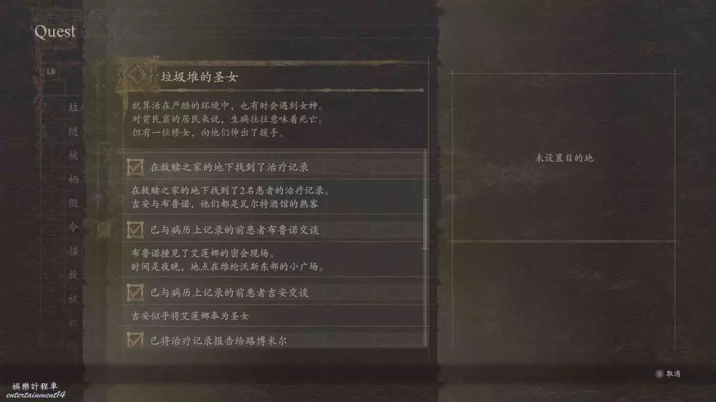 7.找流浪醫生建議走旁邊的大路繞到後面,別走向莫斯裡的道具店,會觸發另一個限時支線,做完聖女的支線再回來接也不急,等待一天的時間後,獲得藥物成分的鑒定,回去找患者報告調查結果,在晚上的時候去修女長密會的地方直接抓捕,抓捕是你控制角色直接抓取就可以,任務到此完成