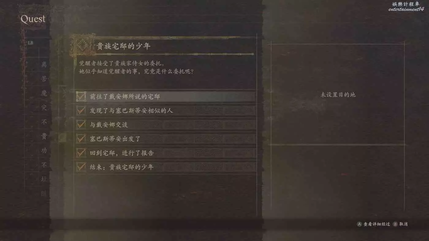 1.做完救贖之家的少女後,遇到女僕戴安娜即可接取任務,讓尋找與塞巴斯蒂安相似的人,就是我們上一個支線的主角:達芙妮,帶著達芙妮去宅邸即可,需要交給塞巴斯蒂安的道具為接觸睡眠和追毒狀態的道具,還有一個獨眼巨人的素材,只有三個道具都對了,塞巴斯蒂安才能平安回來,然後等過一天再來查看情況即可,任務完成。