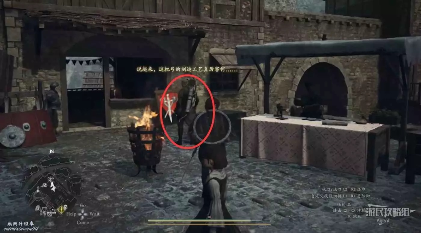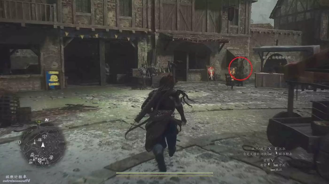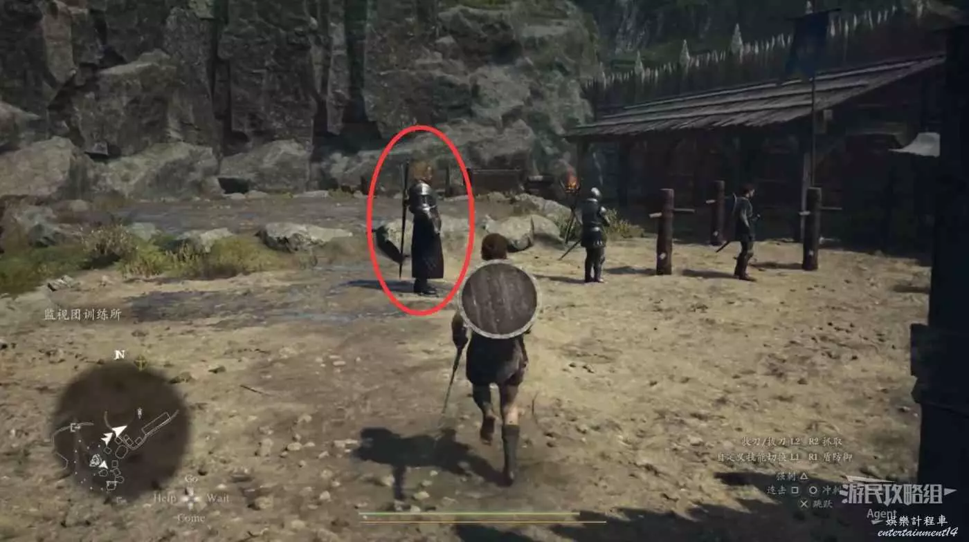 來到下圖位置觸發劇情,會有3個士兵開始與我們戰鬥,此時不要還手,過一段時間會有一個叫拉格納的人打斷戰鬥。