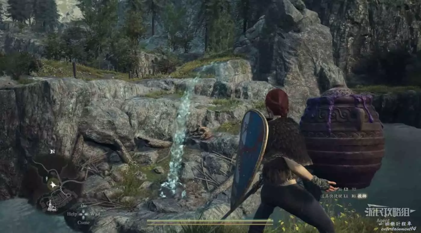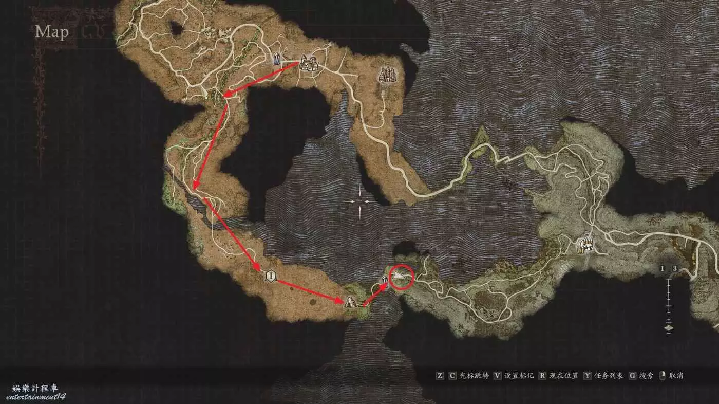 戰鬥結束我們需要沿著下圖所示的路線追逐拉格納,進入前方的洞穴內與拉格納,接著帶拉格納走出洞穴。