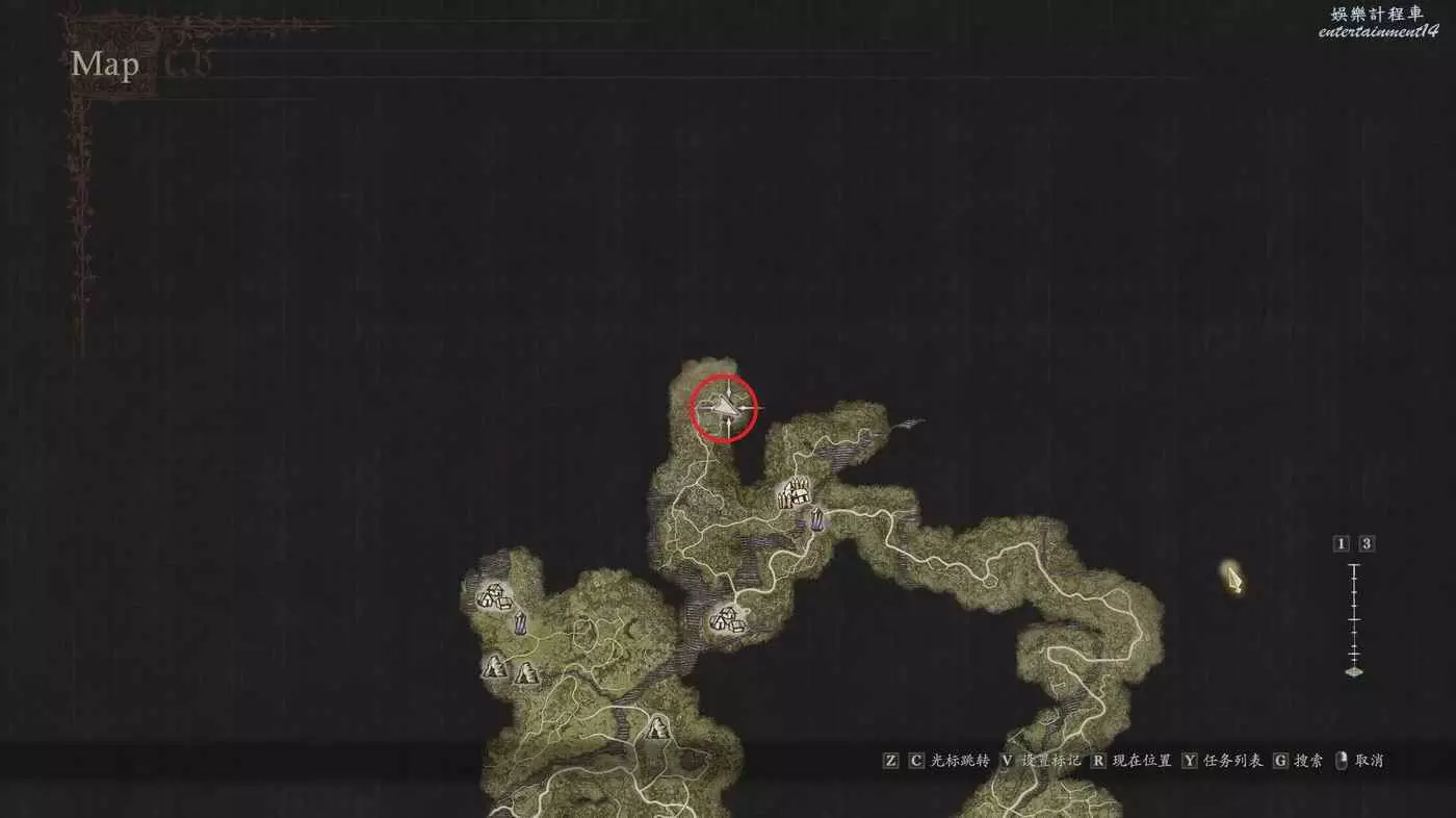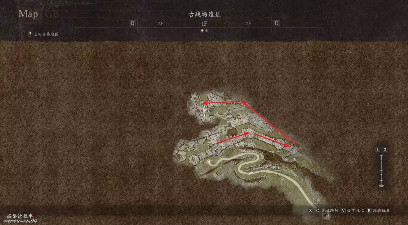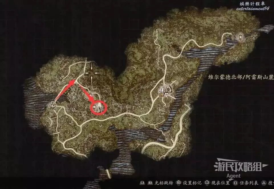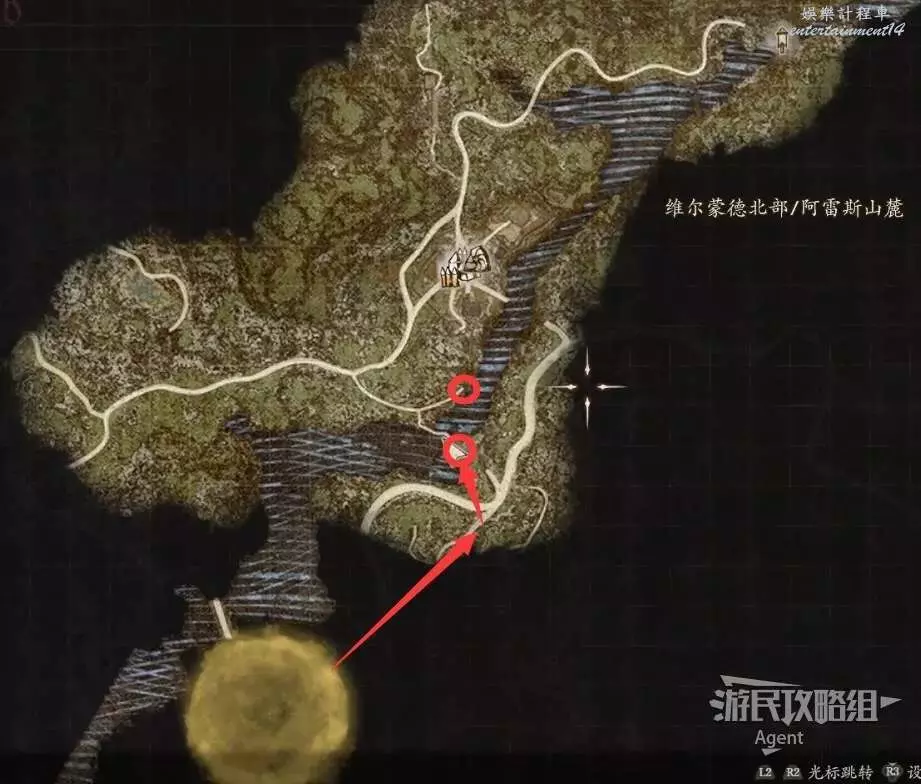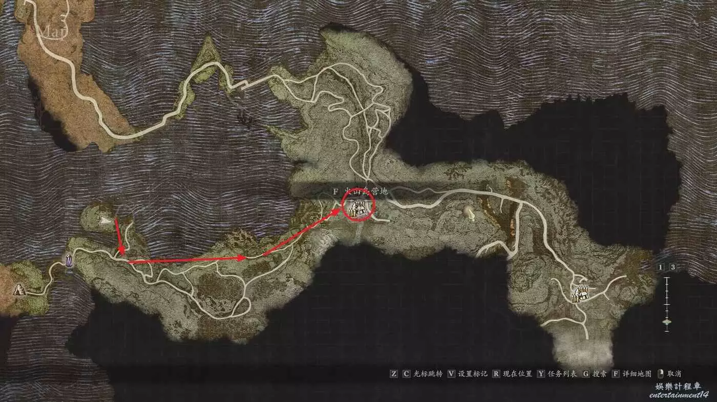 到下圖圈出的位置,可以拿到之前拿不到的寶箱,同時放下梯子解鎖回營地的捷徑。
