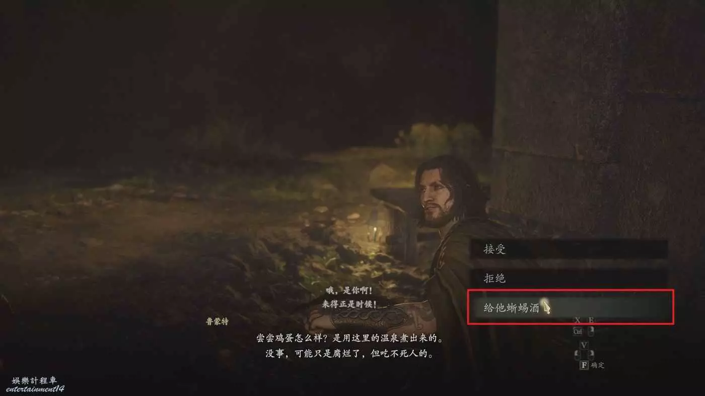 與他對話選擇【給他蜥蜴酒】,第一次只給1瓶不要給多了。接著再次與他對話選擇【給他蜥蜴酒】,第二次要給2瓶。