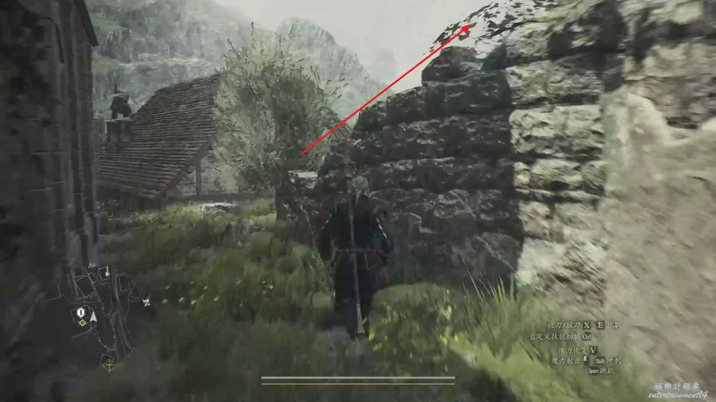 然後沿著箭頭方向走過隧道,可發現一塊隱藏的區域可探索。洞裡的寶箱需要從上面洞口爬梯子下去拿。