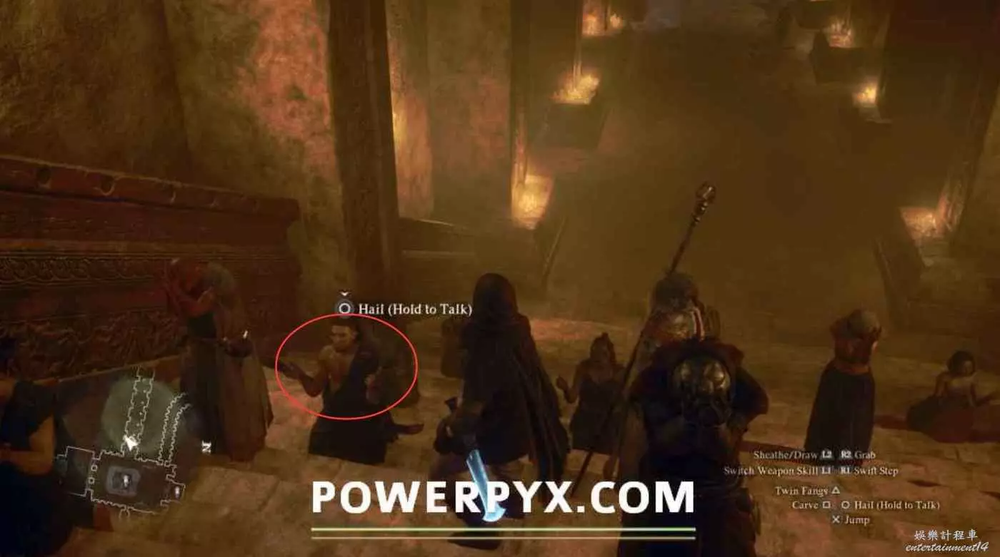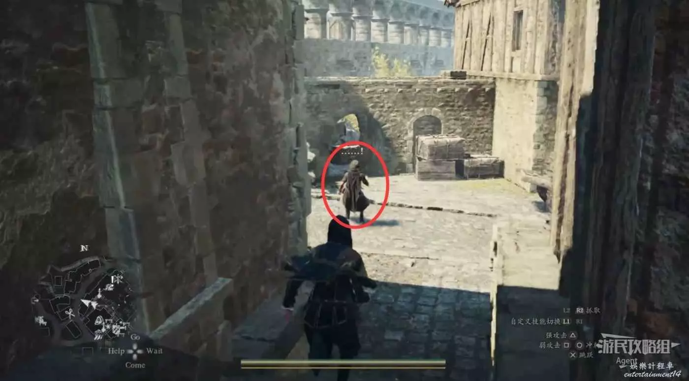 她會直接帶著我們進入宮殿,刺客會穿深藍色的衣服,髮型為長髮,手臂上會有很長的白色疤痕。看到後直接按下抓取鍵撲倒即可。