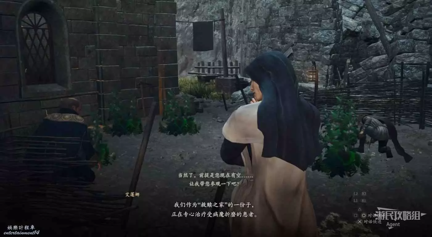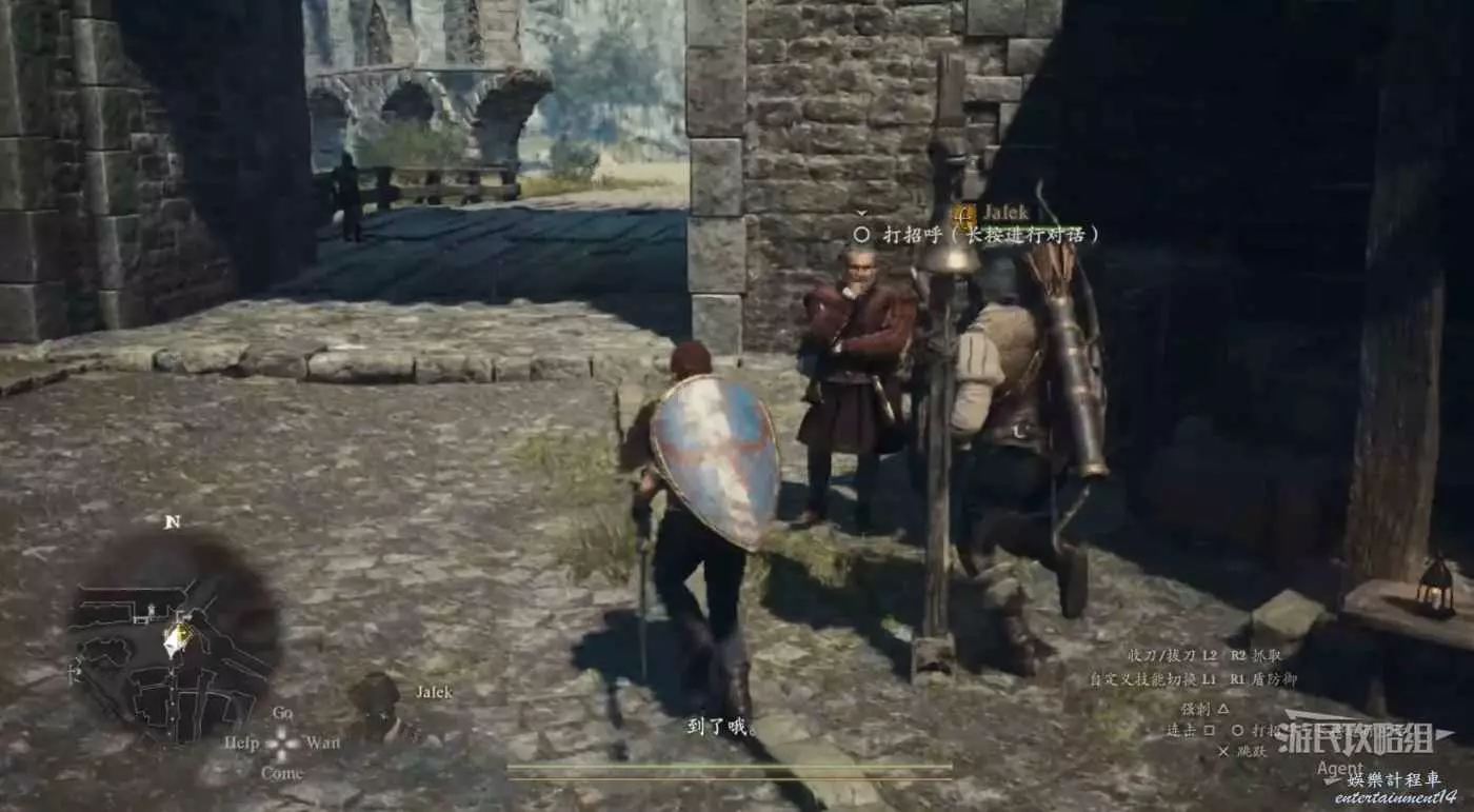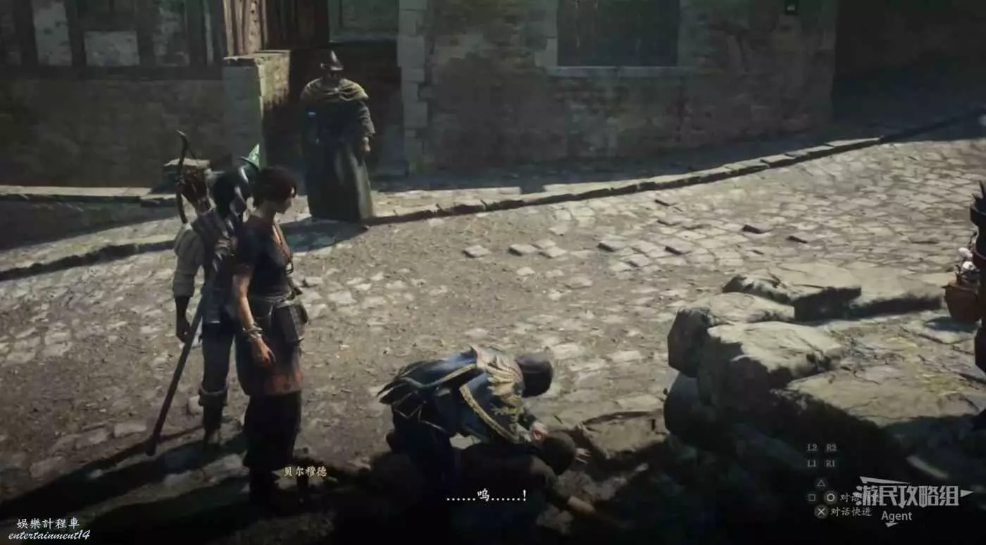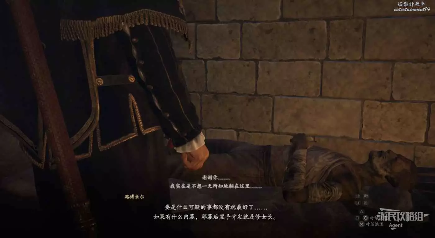 來到下圖所示位置與士兵對話會觸發關於前置任務“掠奪與慈悲”的消息,士兵會拜託我們去監獄與犯人溝通。