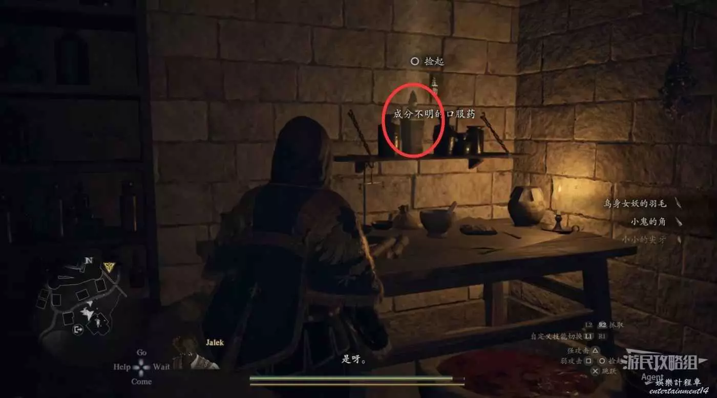 跟隨老人來到他的家裡,桌子上可以拿到一瓶蜥蜴酒,與老人再次對話接取一路護送他到火山口溫泉的任務。