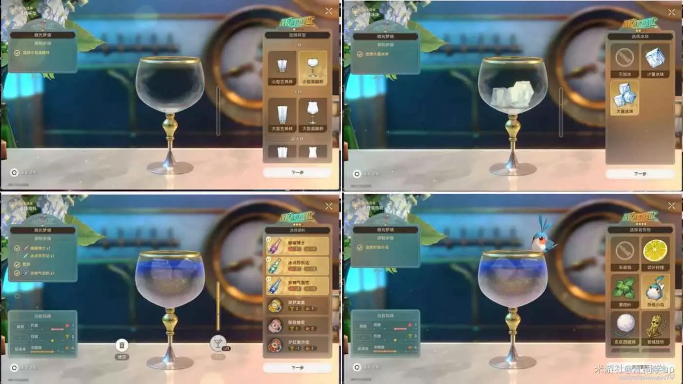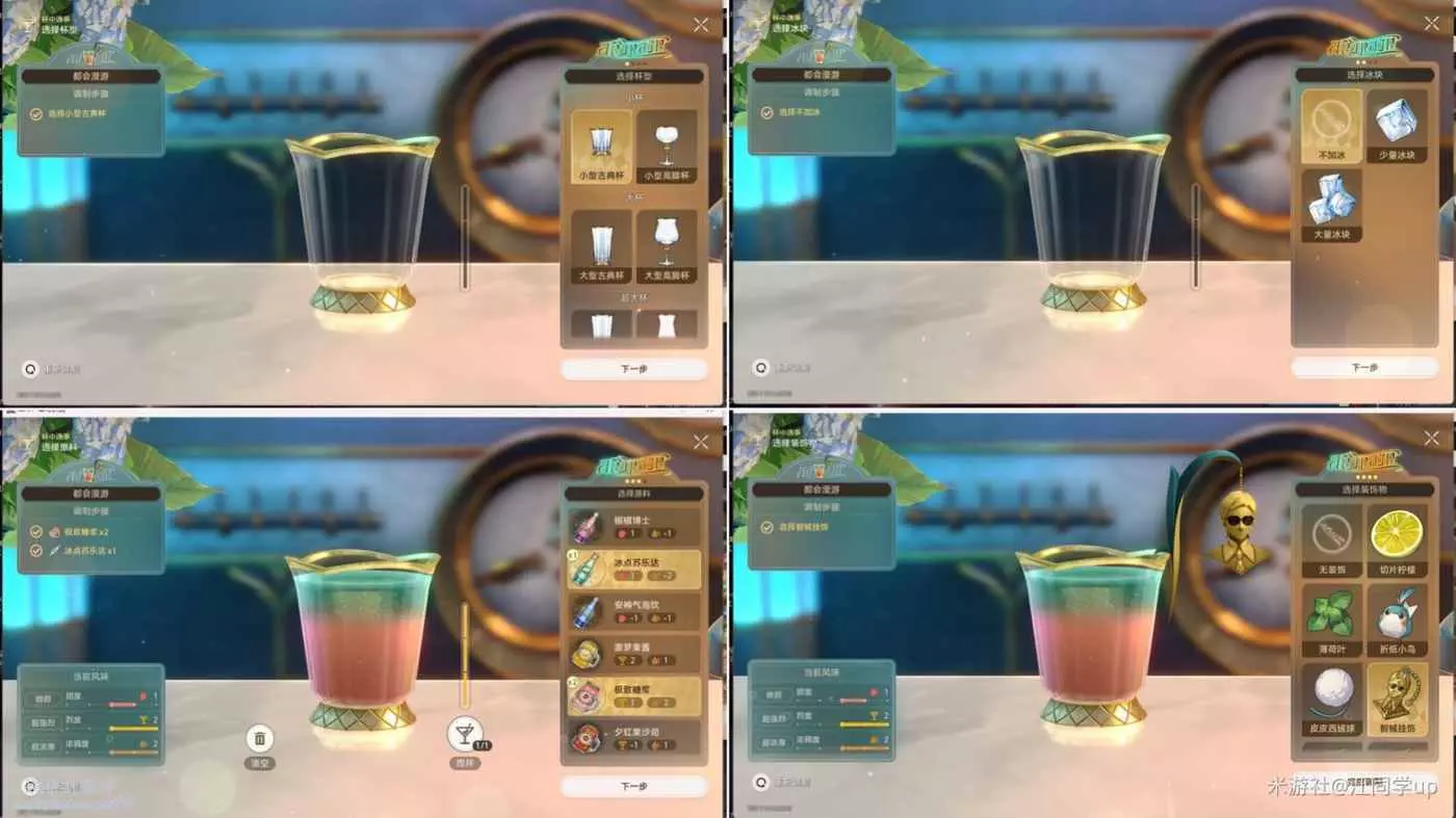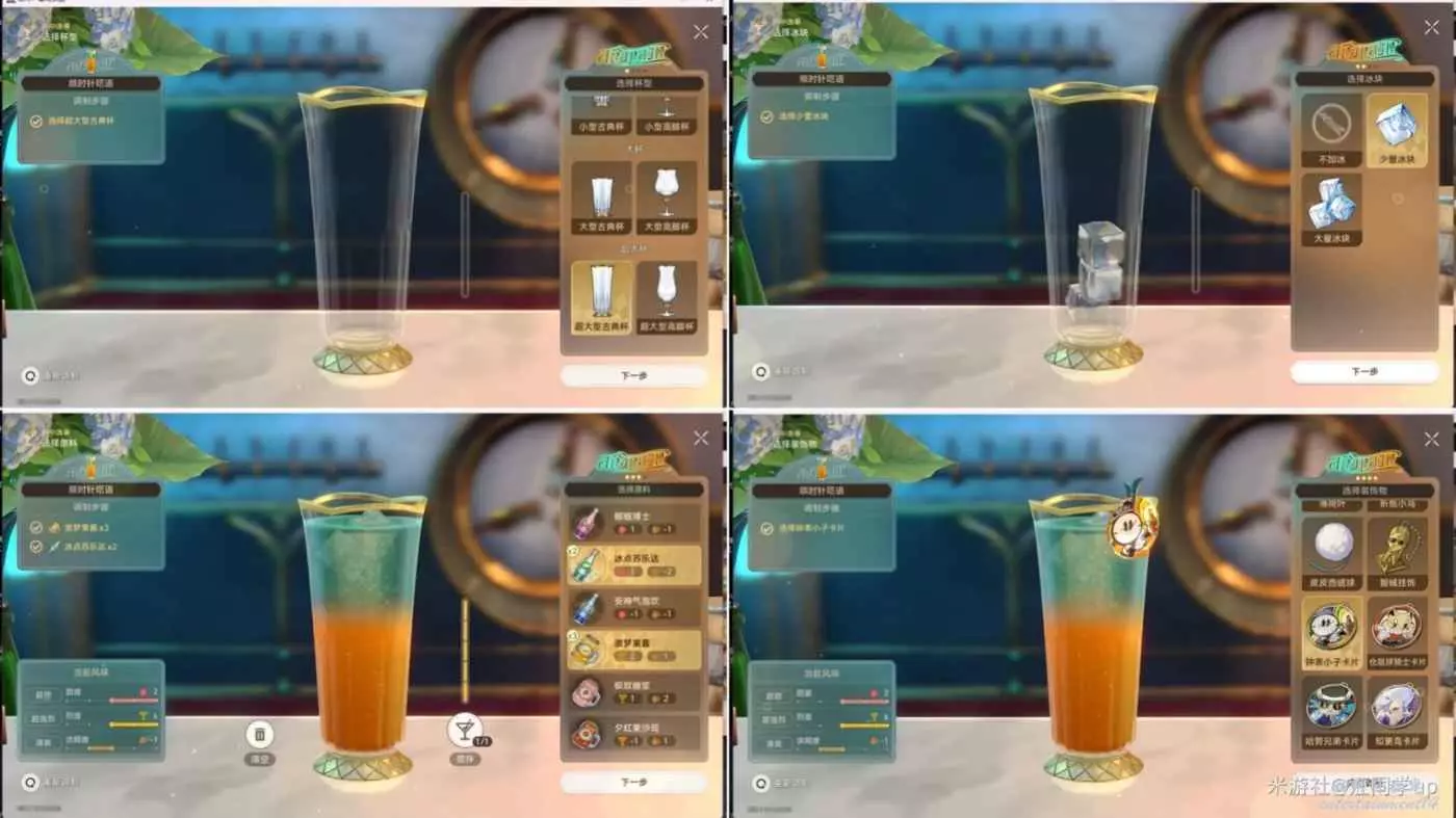 (2)12個配方推導,可以在做完後面任務【憂傷的怪物們·其六】後,再統一來完成即可,完成12個配方推導後,可獲得成就《夢核朋克酒保行動》,屬於【與你同行的回憶】,其中前2步杯子和冰塊會自動幫我們選好,我們只需要新增原料和裝飾物即可