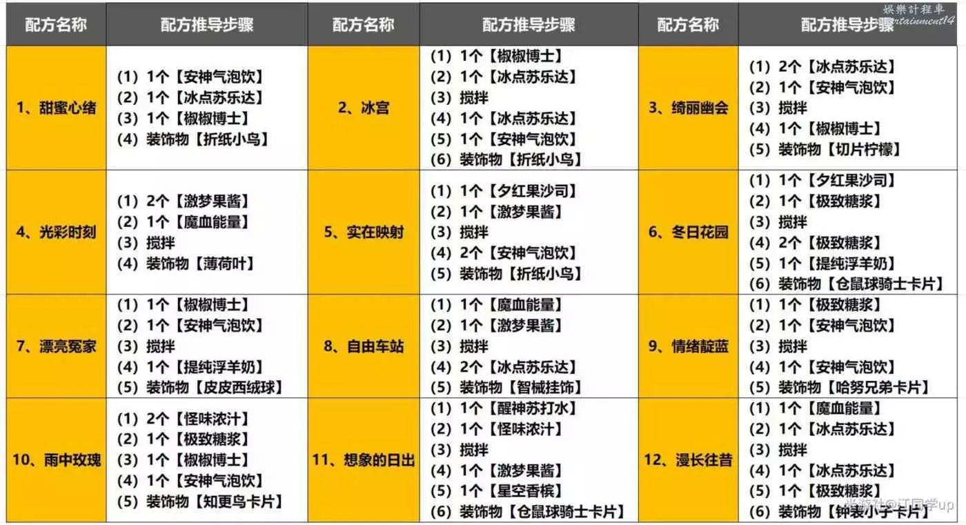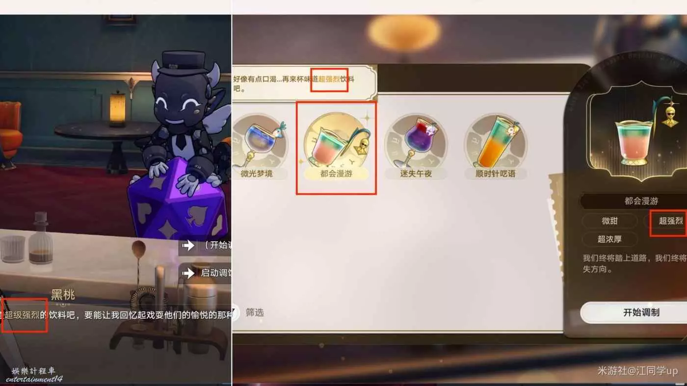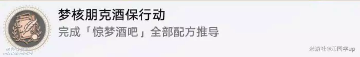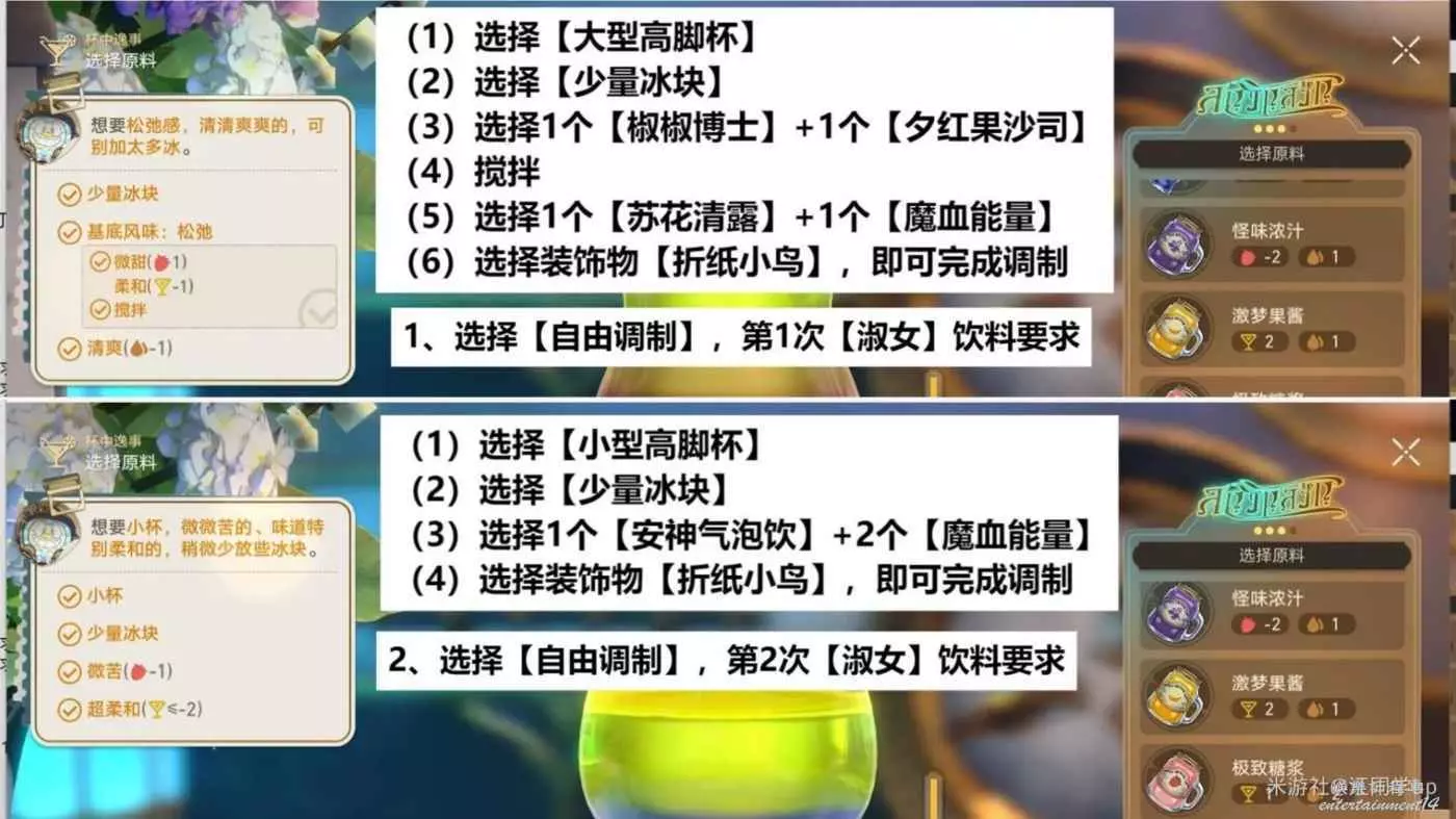 (2)12個配方推導,可以在做完後面任務【憂傷的怪物們·其六】後,再統一來完成即可,完成12個配方推導後,可獲得成就《夢核朋克酒保行動》,屬於【與你同行的回憶】,其中前2步杯子和冰塊會自動幫我們選好,我們只需要新增原料和裝飾物即可