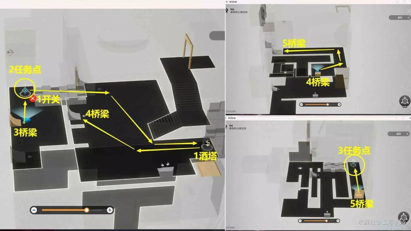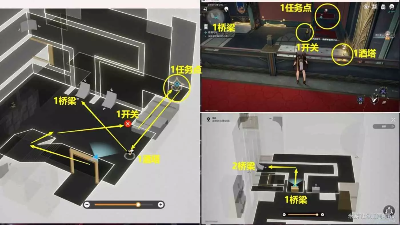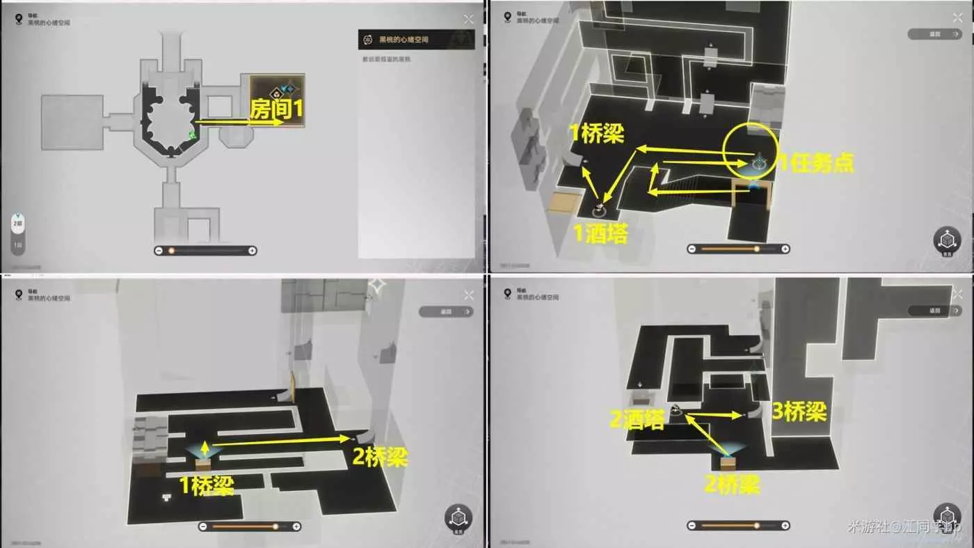 (1)跟之前【黑桃】的心緒空間一樣,進副本追蹤任務進入【房間1】,先打開【1開關】去【1任務點】和【淑女】對完話,然後去【1酒塔】獲得次數後,從【1橋樑】上去,接著從【2橋樑】上去
