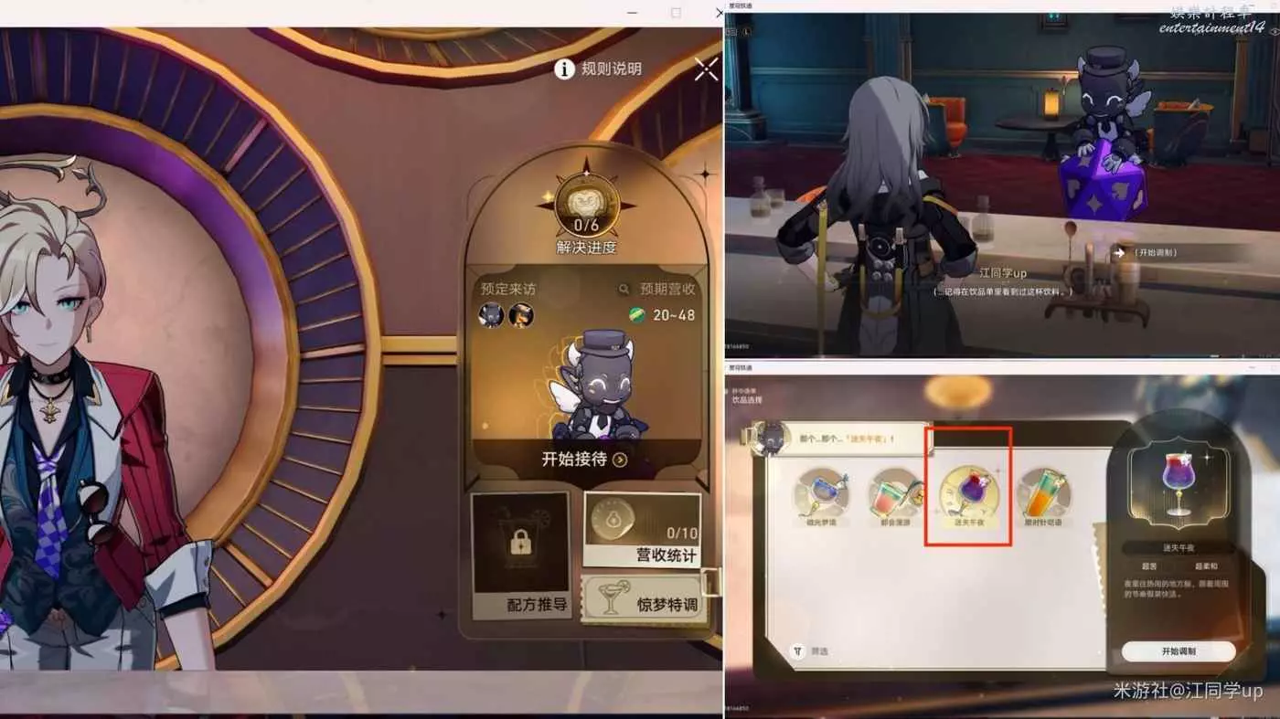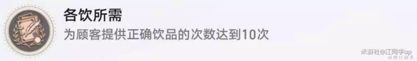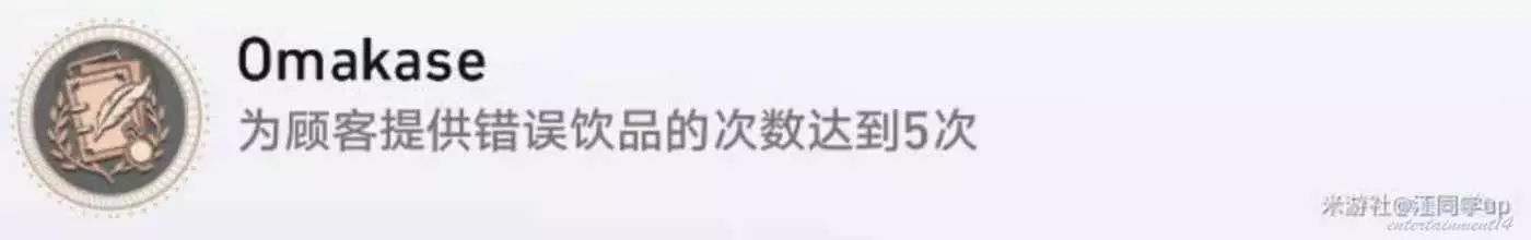 1、完成上面全部任務後,再次【開始接待】顧客,每個顧客對飲品都有要求,我們只要故意不按照顧客的要求製作最少錯誤的5次飲品後(沒有達到顧客的要求時,最後會有提示),即可獲得成就《Omakase》,屬於【與你同行的回憶】,可直接製作5次上面說的【最適合我的飲品】就行