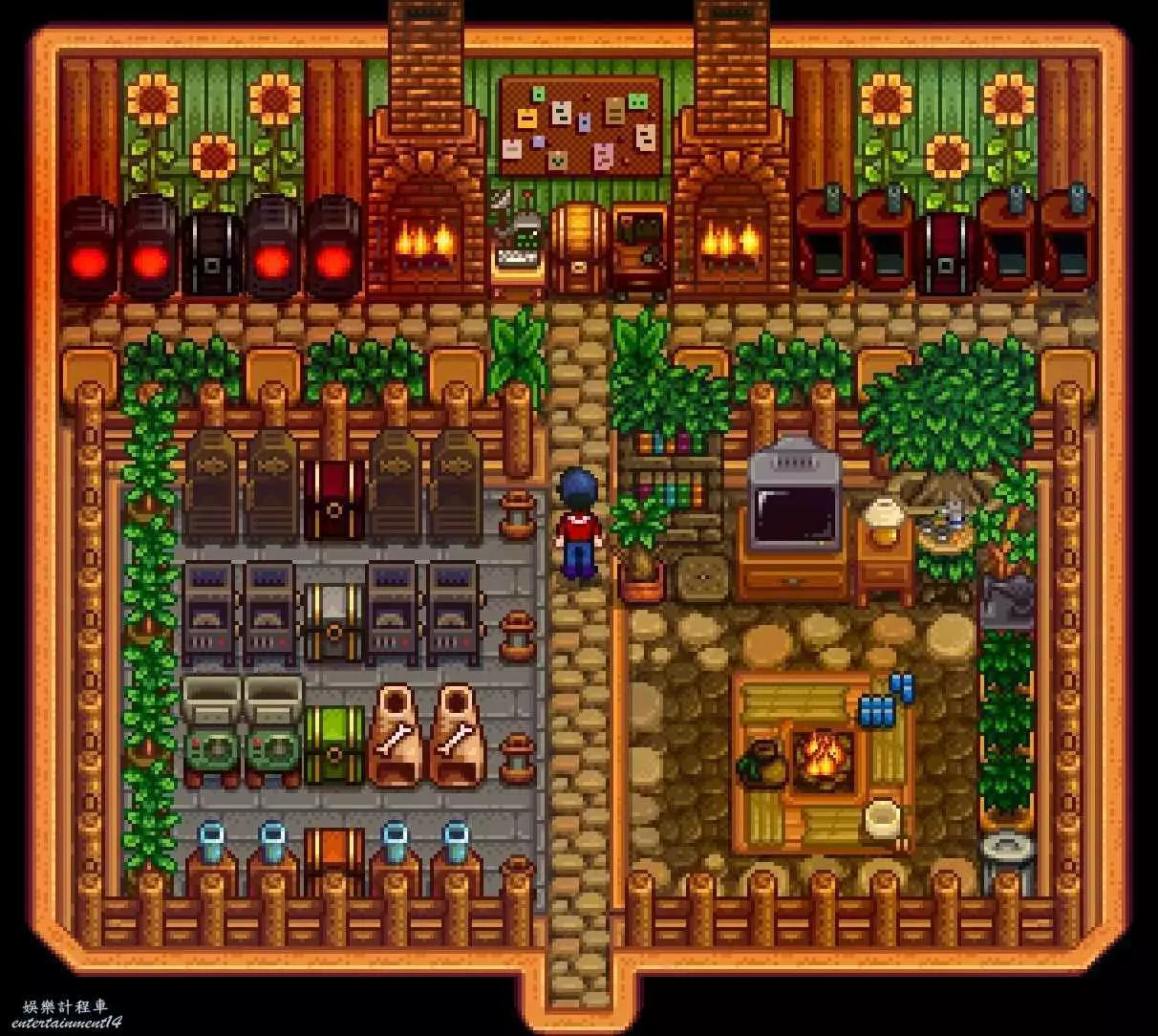可相容實用性以及美觀度,花盆可以種茶苗以及咖啡豆,採用部分1.6新裝飾,部分裝飾(可樂瓶)需要加入喬家超市購買喬家裝飾目錄獲得(加入喬家超市不僅可以不讓莫里斯消失,且山姆和謝恩也不會失業,奸商皮埃爾週三還不休息了,電影院也可以花錢建,拋開你那沒用的良心,加入喬家,除了小鎮英雄獎盃沒有其餘任何損失)書架和綠植看板需要前往法師處購買朱尼摩裝飾目錄。