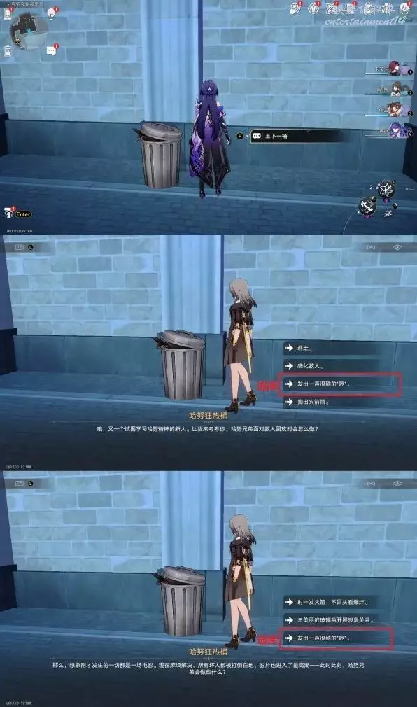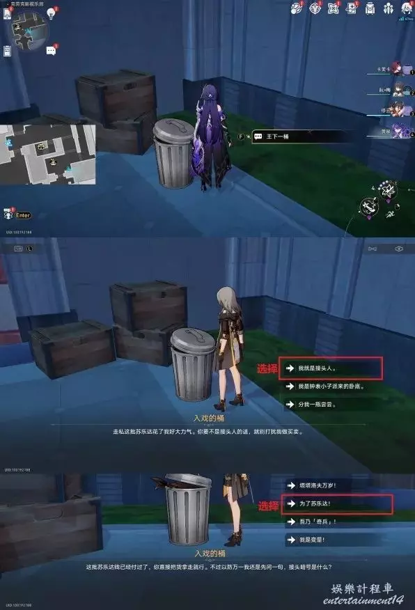 王下一桶獎勵寶箱,位置在牆壁旁。之對話互動後會給出兩個問題,“兩個問題全部答對”就能獲得獎勵。