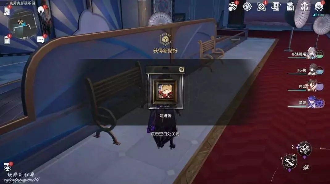 貼紙位置在地圖【克勞克影視樂園】2層上方區域的倉鼠球騎士拍攝片場的椅子上。