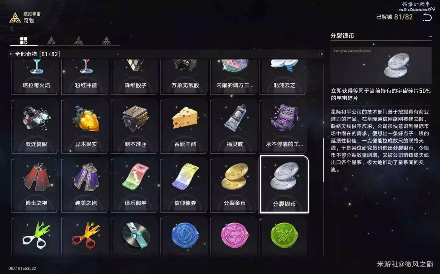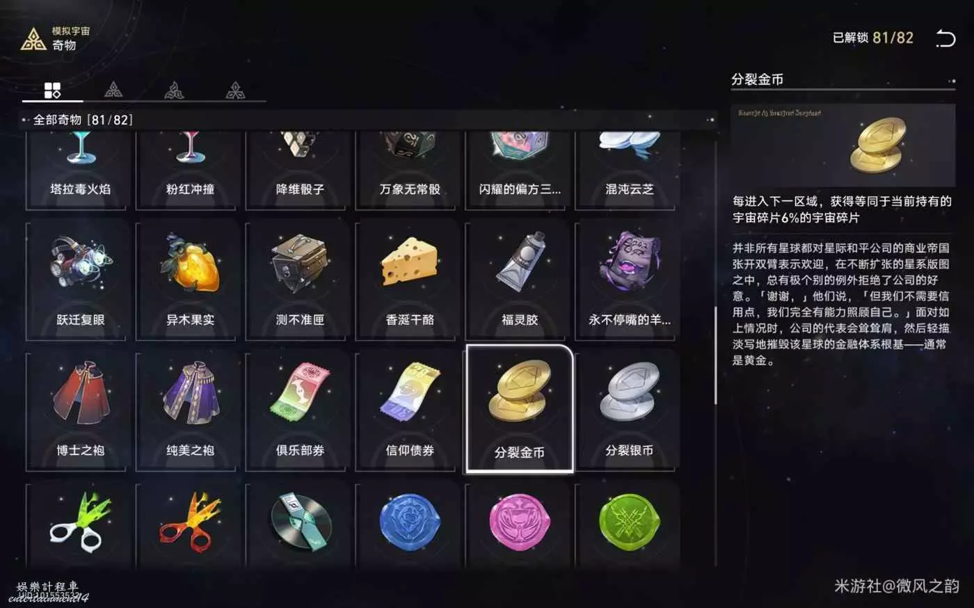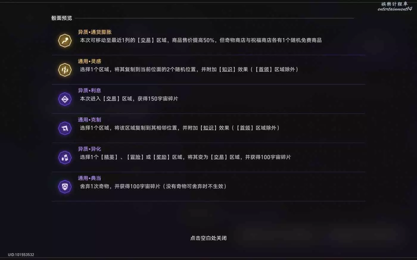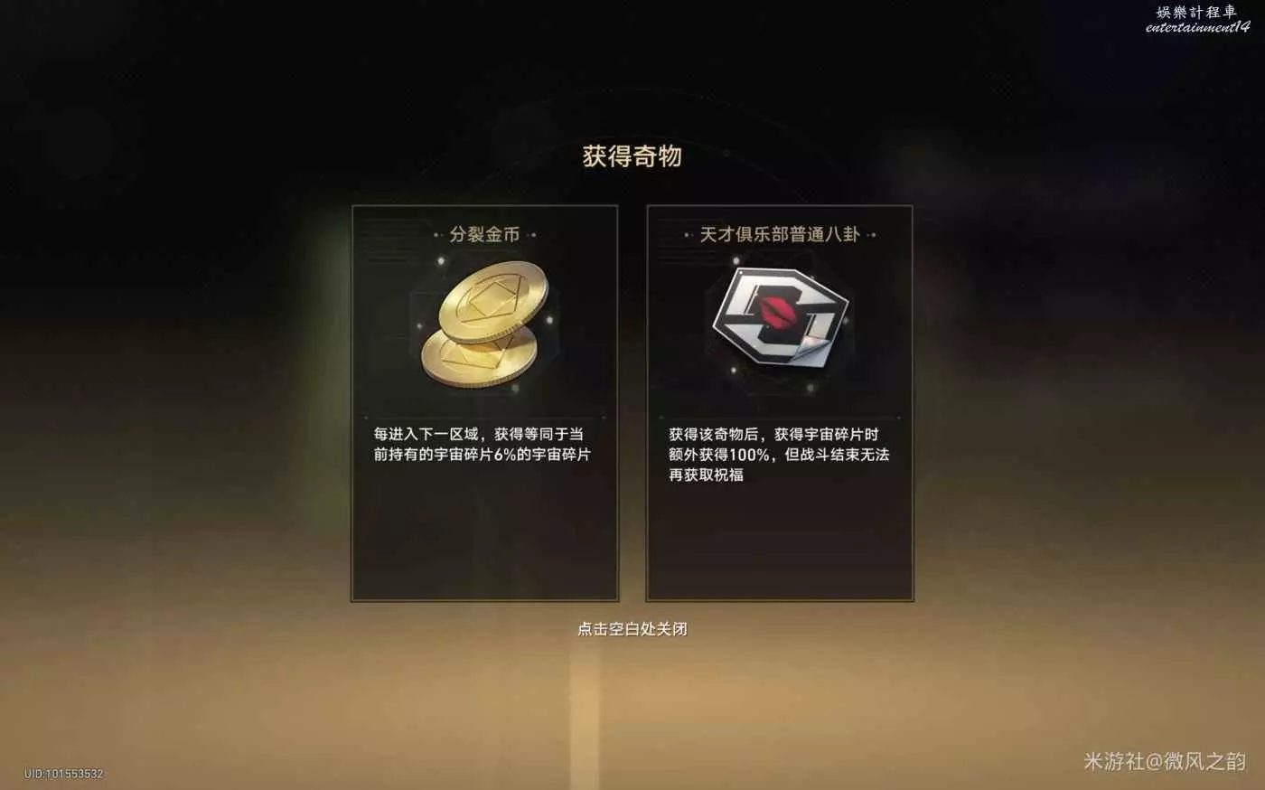 還有一些奇物對我們來說遇到了就是錦上添花的作用,總結下來就是,怎麼可以獲得更多的宇宙碎片就怎麼選,然後盡可能的去交易區消費宇宙碎片。