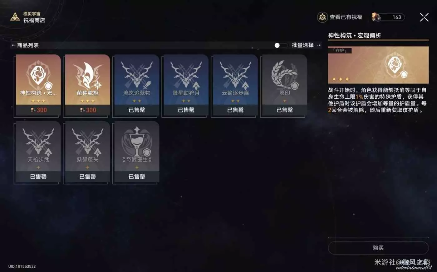 該骰面的玩法是:收集宇宙碎片,然後頻繁的進入交易區買買買,買的越多,我們可獲得的祝福和奇物也就越多,同時還能獲得高額屬性加成。