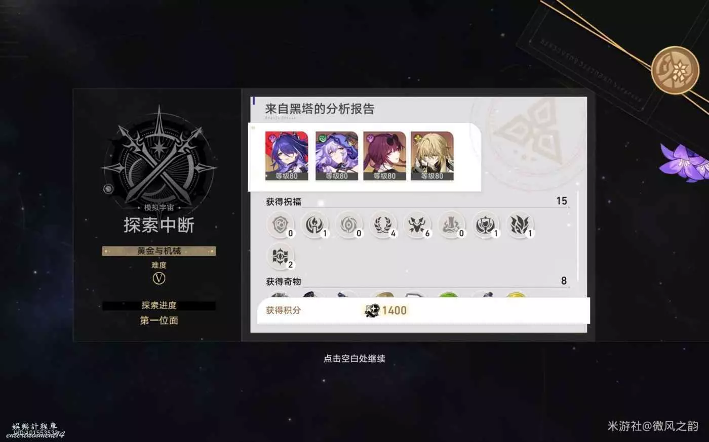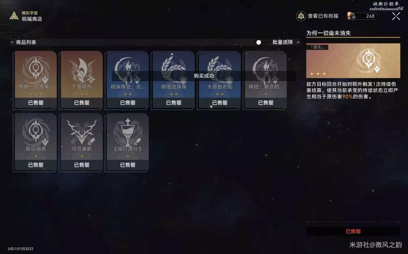然後沒打過第一位面的boss,遺憾退場。這也變向的給大家展示了,如果你宇宙碎片多,但是因為沒進交易區買買買獲得奇物和祝福以及大量加成,也是會翻車的。
