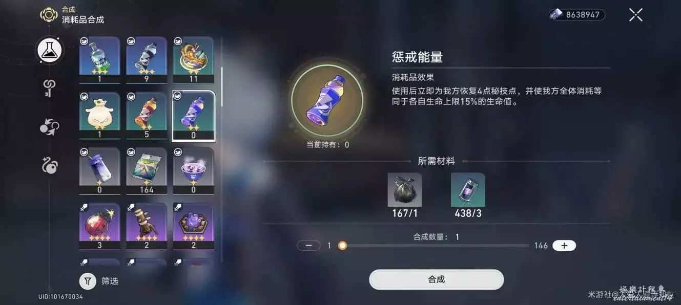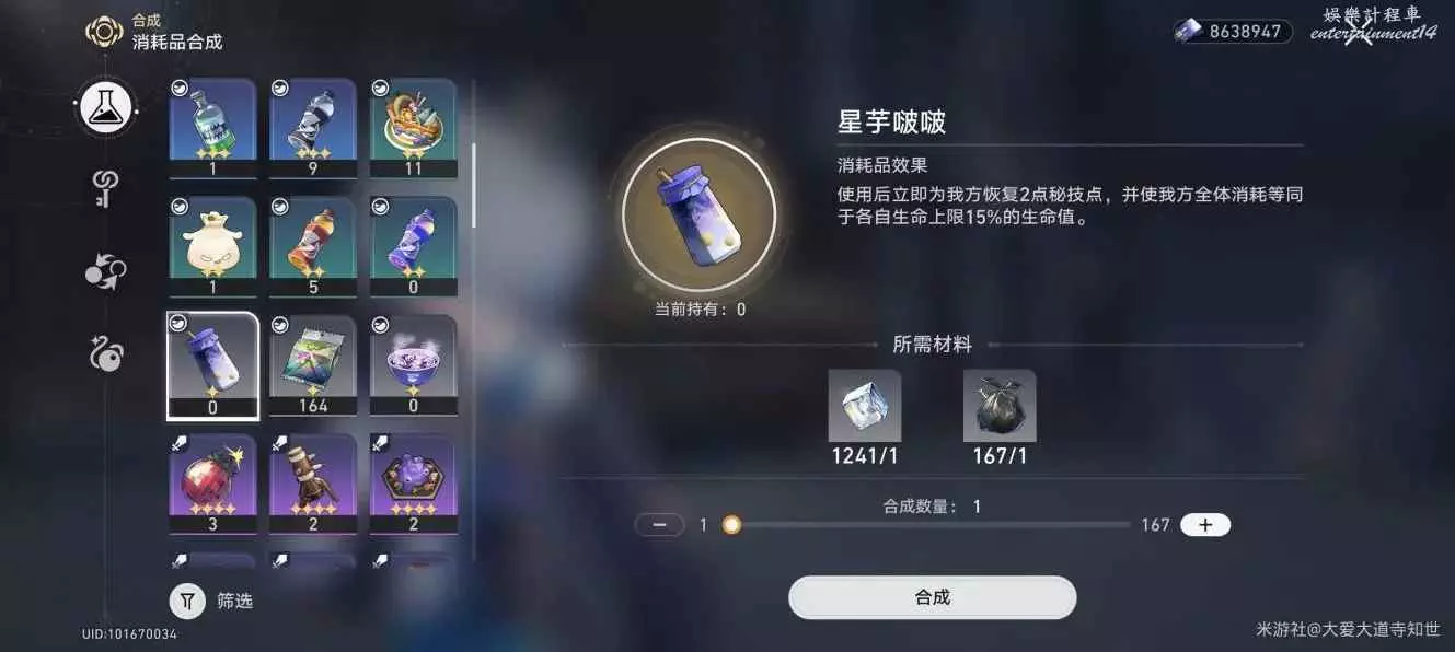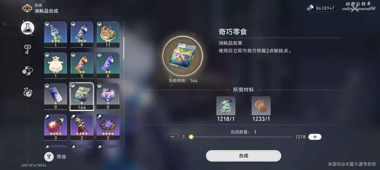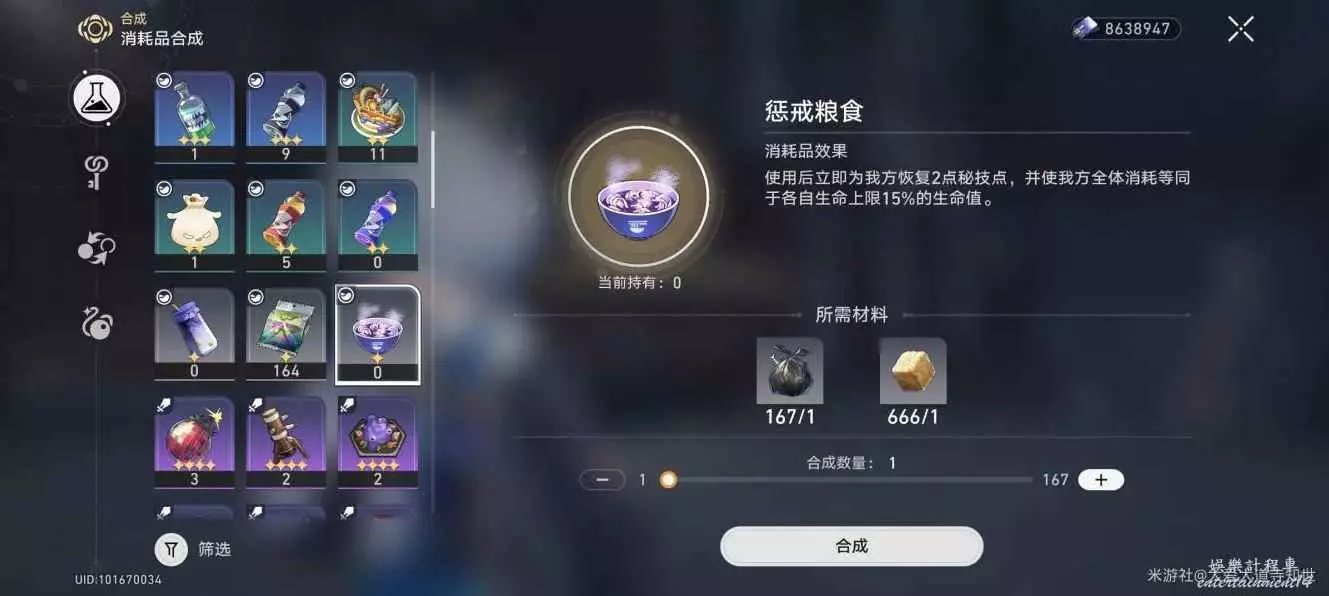 按圖中順序,1,3,4,5,6是買的,商店刷新有冷卻,7,8,9,10做的,理論上,材料足夠的話沒有製作數量限制。有些食物會扣血,不過這是事兒嗎?