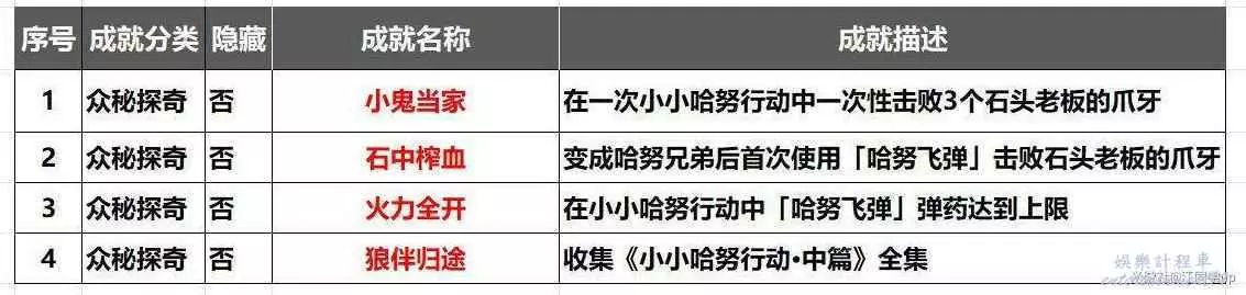 1.在2.1版本地圖【朝露公館】和【克勞克影視樂園】的【小小哈努行動】共有4個相關成就,前3個成就可以在第1處【小小哈努行動】位置完成