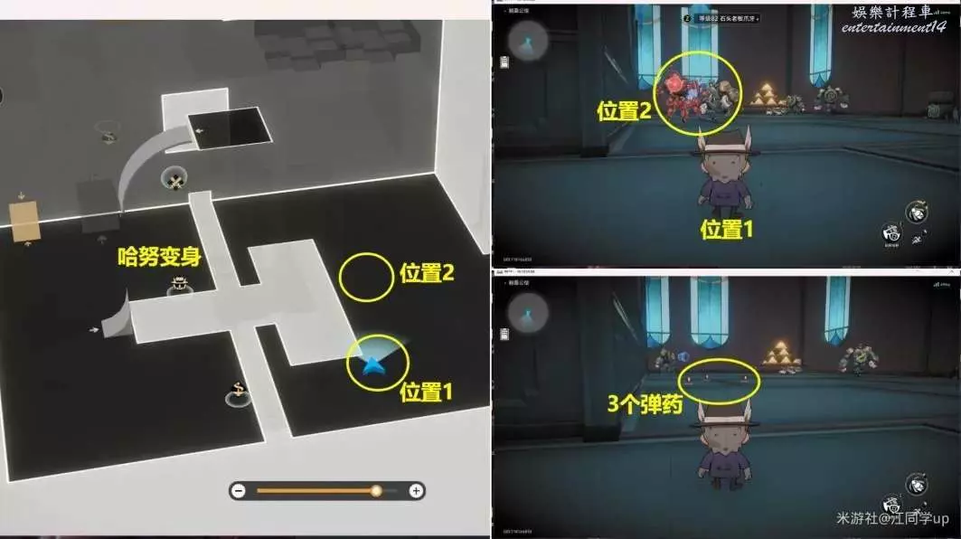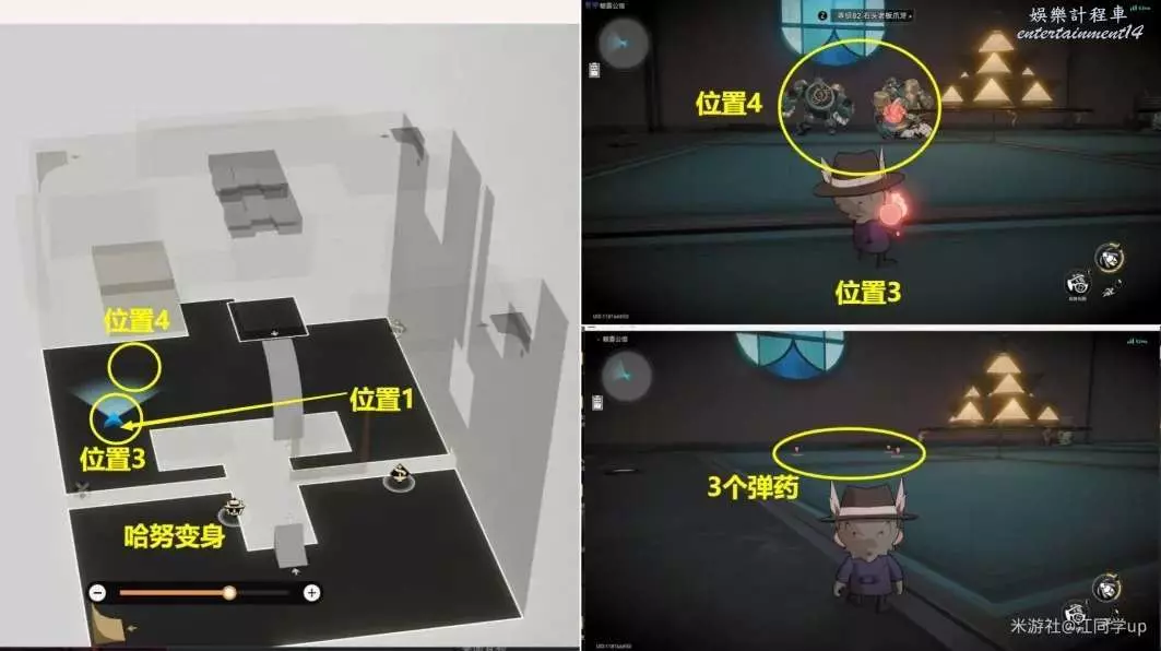 4.接著等怪背靠我們時過去,然後等右邊2個怪到【位置1】時,用【火箭筒】打掉【位置1】的炸彈,將右邊2個怪一塊炸死,當然你能將3個怪一快炸死也行,然後拾取怪物死後掉落的彈藥,將【寶箱1】位置的3個怪一塊打死,開啟【寶箱1】,可獲得【小小哈努行動·中篇第三章】。