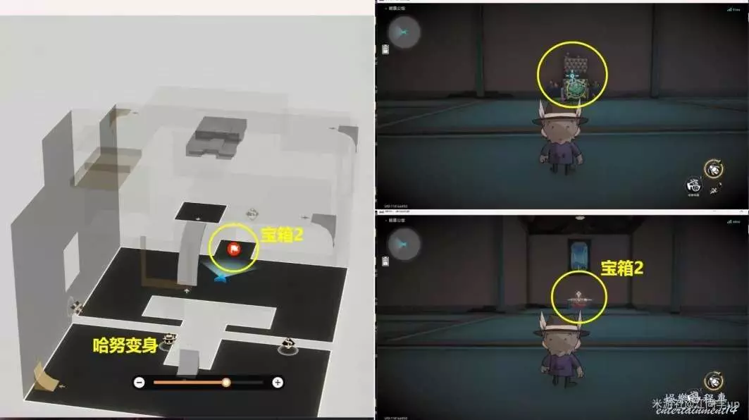 2.接著來到下圖位置變身哈努後,去拾取【碎拼1】【寶箱1】和【碎拼2】【火箭筒】。