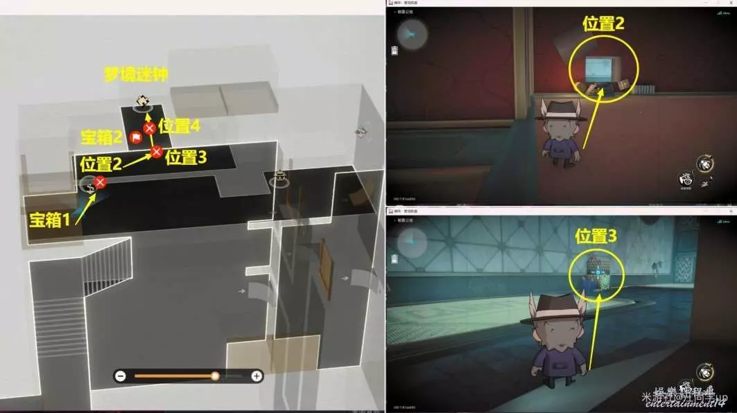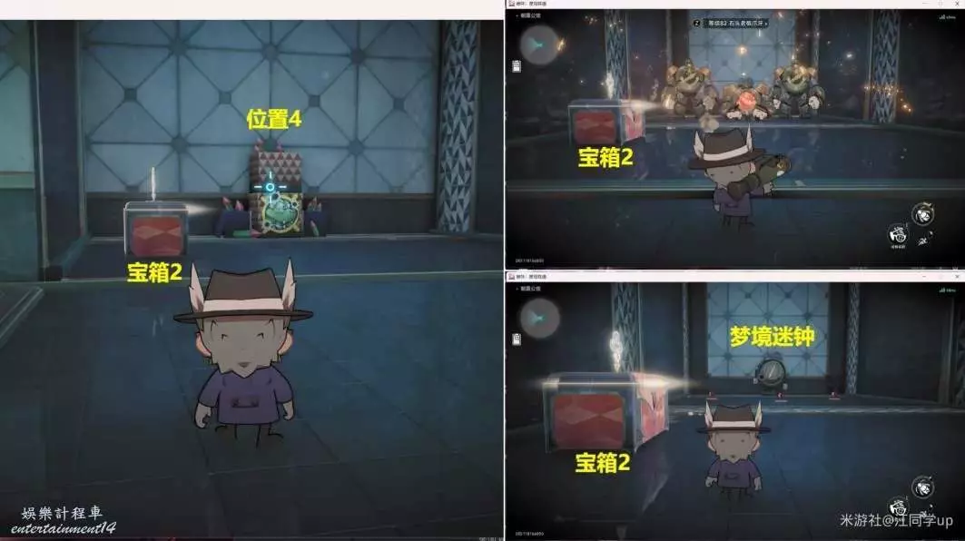 5.然後從下圖【位置2】進去,進去後,將【位置3】打開後,裡面是【寶箱2】,接著再將【位置4】打開後,打掉裡面的3個怪後,裡面有個【夢境迷鐘】解密。