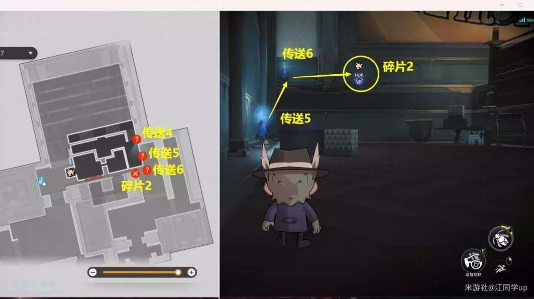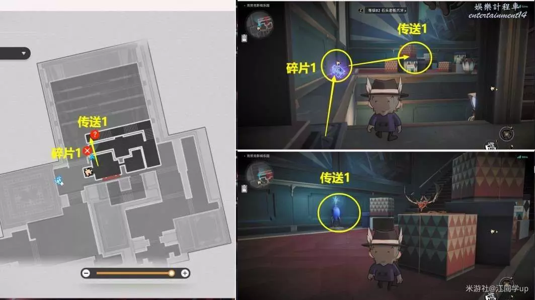 3.接著來到下圖位置拾取【碎片1】後,從【傳送1】位置飛上去【傳送2】位置。