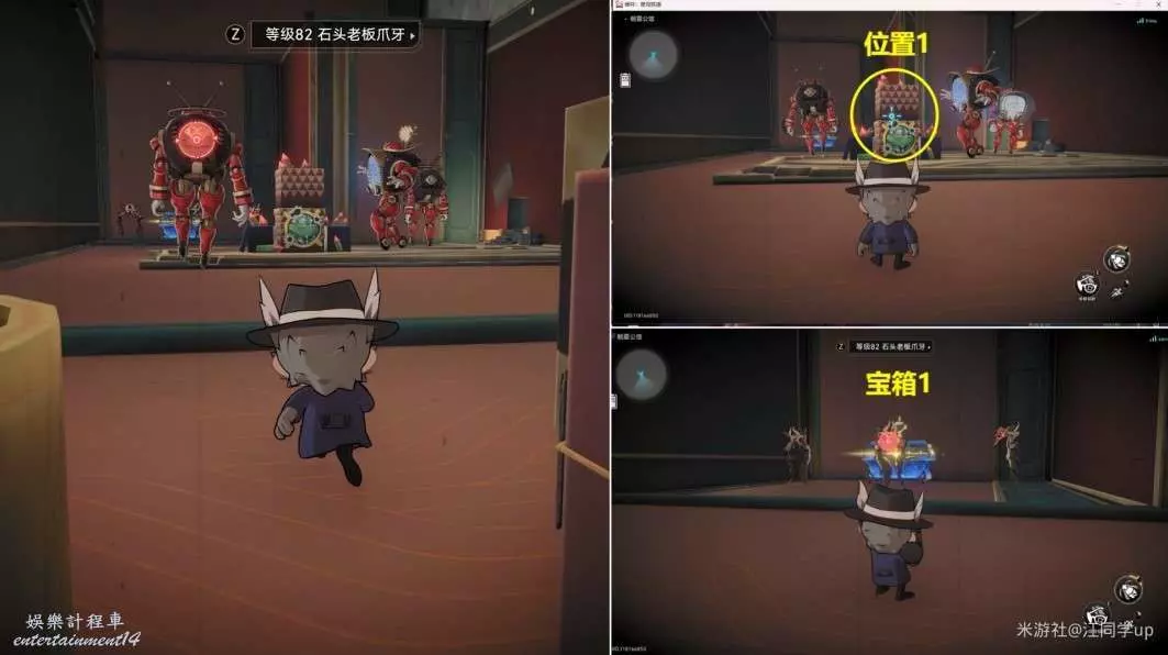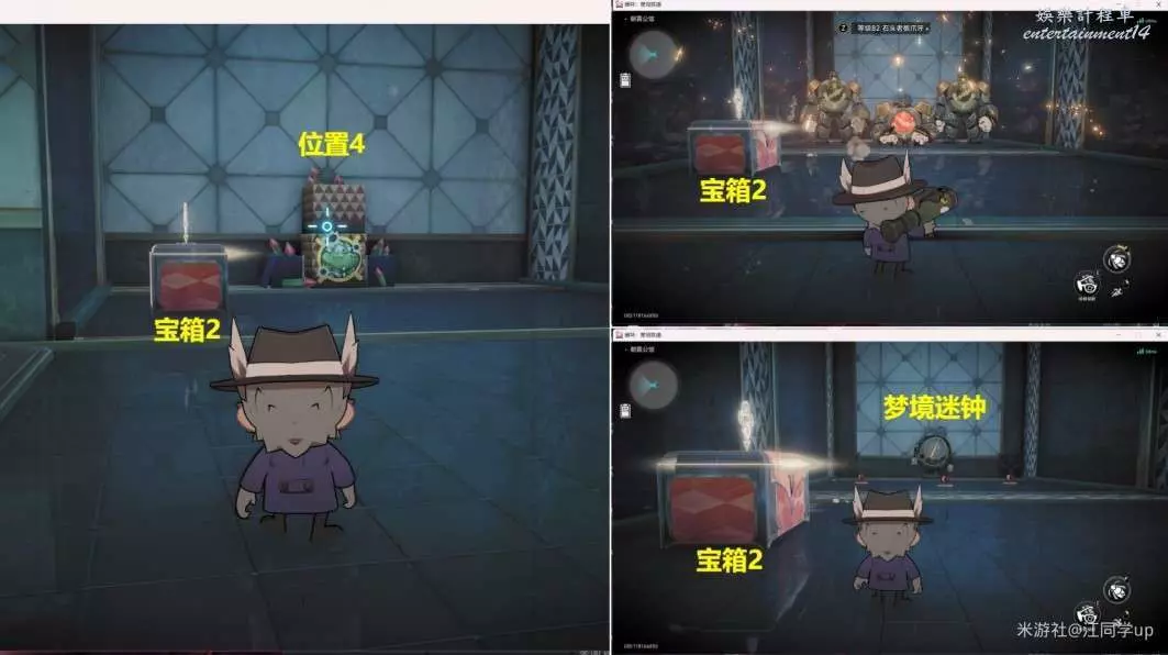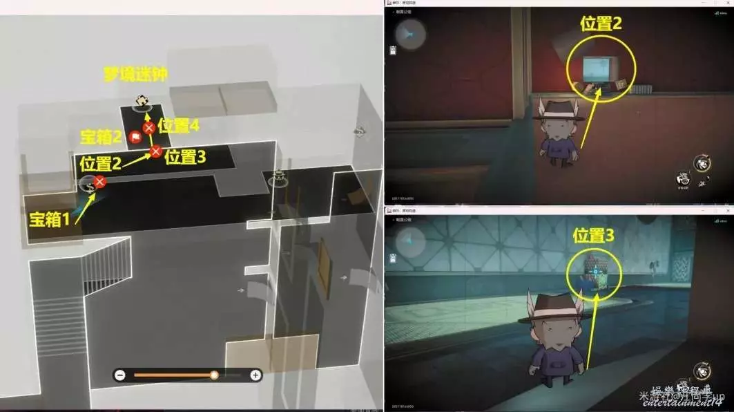 (4)然後從下圖【位置2】進去,進去後,將【位置3】打開後,裡面是【寶箱2】,接著再將【位置4】打開後,打掉裡面的3個怪後,裡面就是第3個【夢境迷鐘】解密