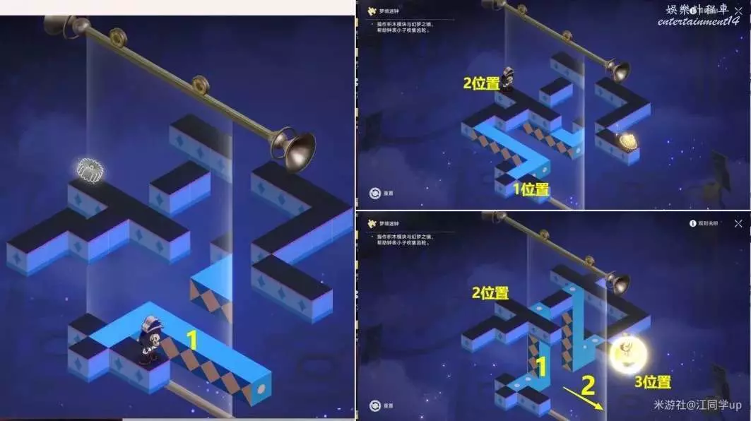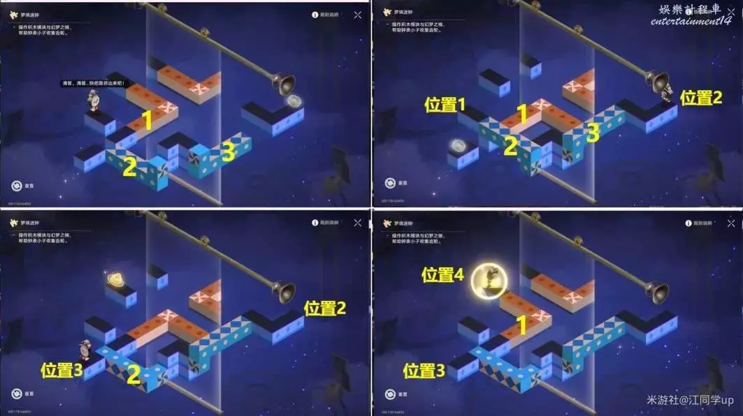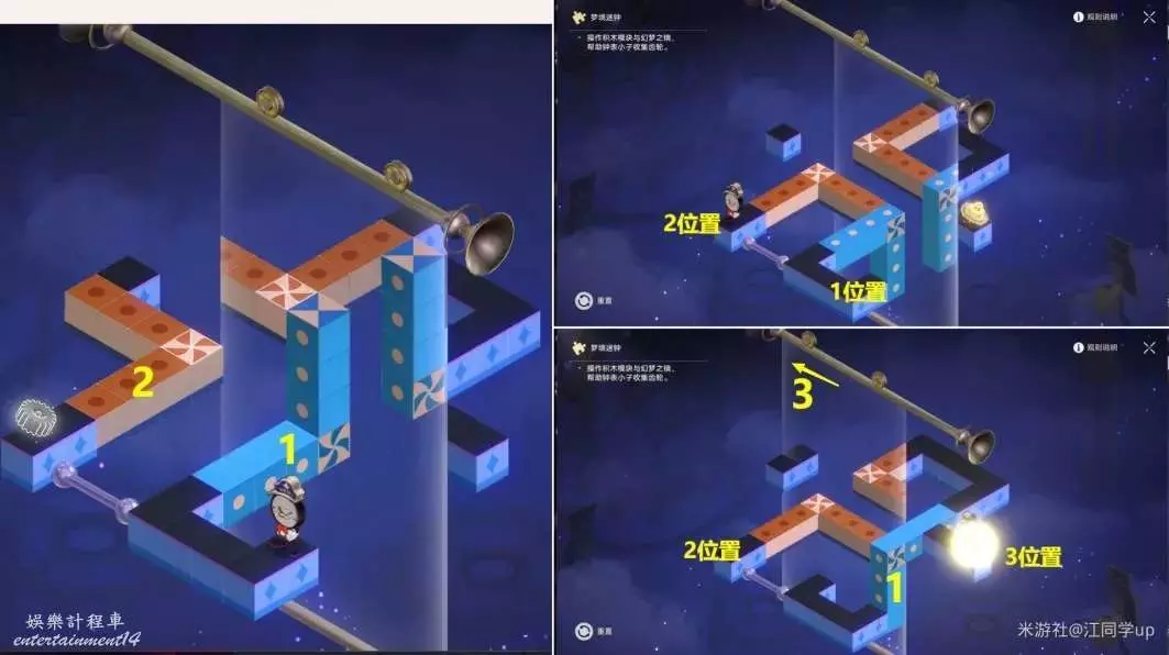 (2)將1藍色模組點擊旋轉1次,將3鏡子往右上移動到滑竿頂端位置,【鐘錶小子】會從位置2到位置3,解密完成