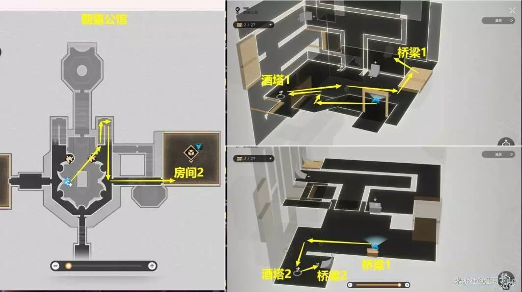 (1)第3個【夢境迷鐘】在【房間2】裡面,進入【房間2】後,從【酒塔1】獲得次數後,從【橋樑1】上去,然後再從【酒塔2】獲得次數後,從【橋樑2】上去