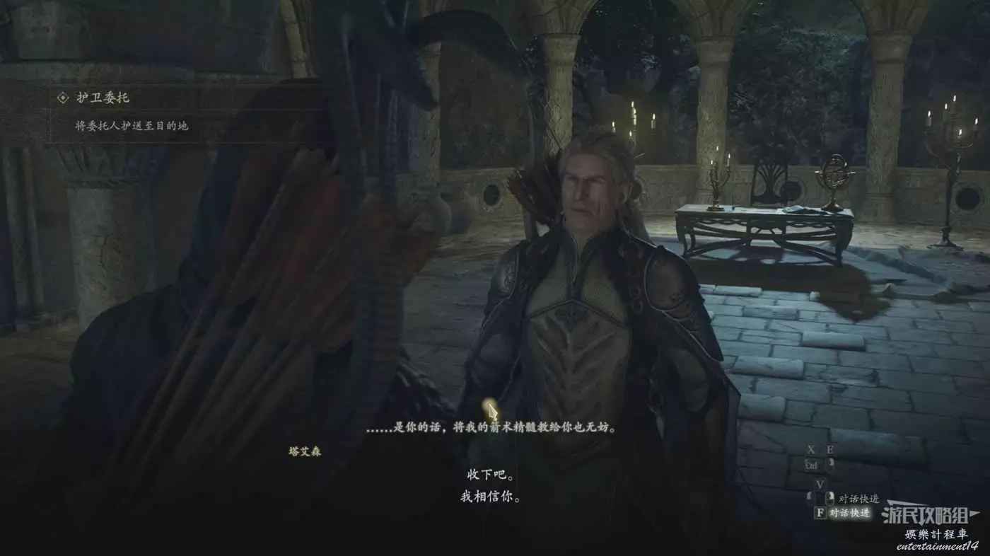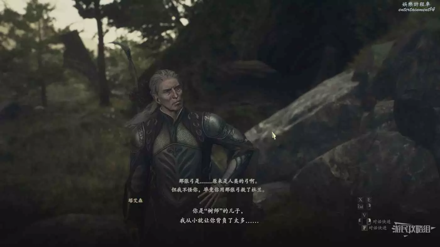 到達聖樹隱村需要拯救精靈的妹妹,跟著精靈前往任務目標地點,先拯救他的妹妹並與老父親對話完成任務,去找附近的篝火睡到第二天,來到聖樹隱村再次與老父親對話接取任務。