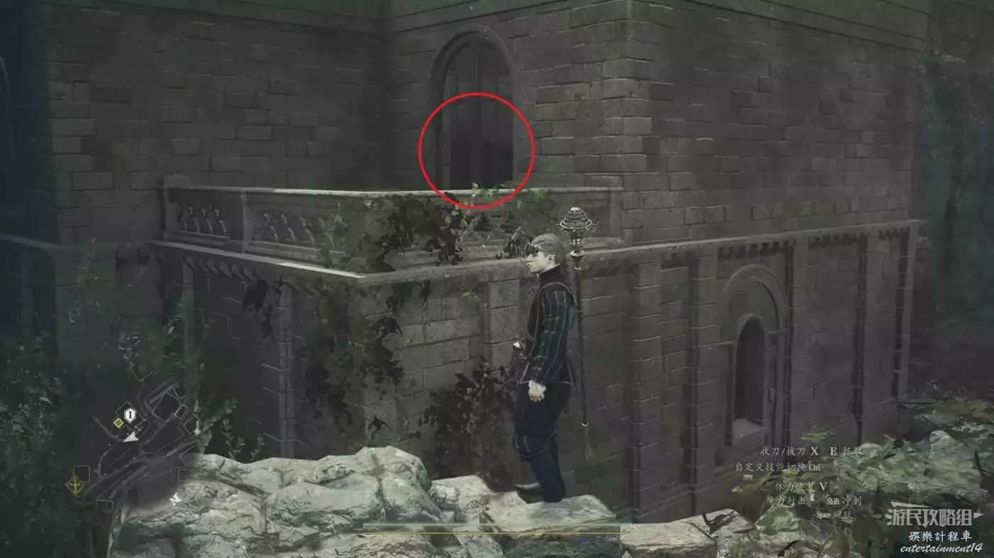 出門轉頭面朝房子,往右後放走,沿著右側的牆爬到最高點。