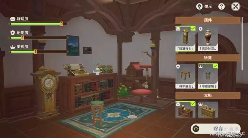 從上到下選擇【精準守時】、【率意豪情】、【閑閱書閣】、【輝煌青琅】、【玫瑰紅樹屋】即可,搭配方式只有一種。