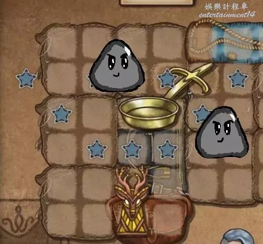 然後鋼黏可以在以下位置二選一放置,儘量保證有兩個和鍋相鄰的食物,能連到鋼黏的黃點上,其中一個必須是香蕉,香蕉形狀最有用的一次。