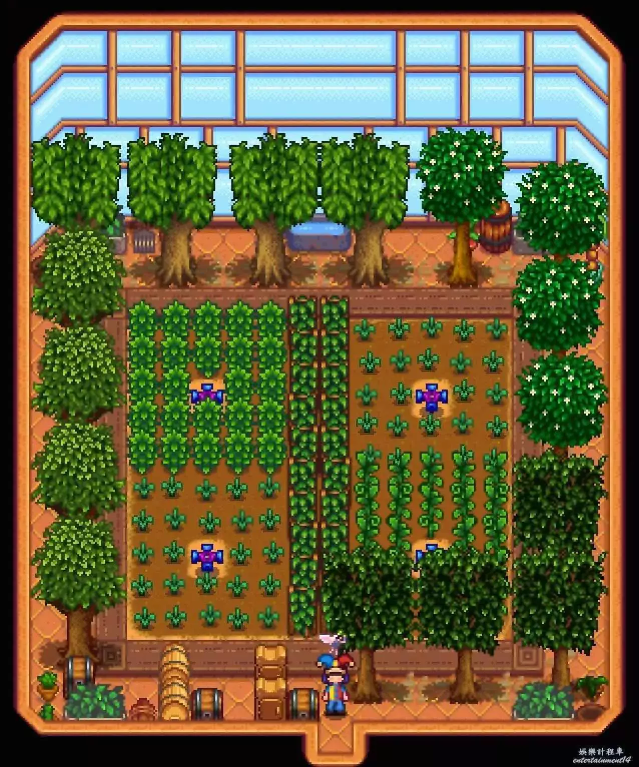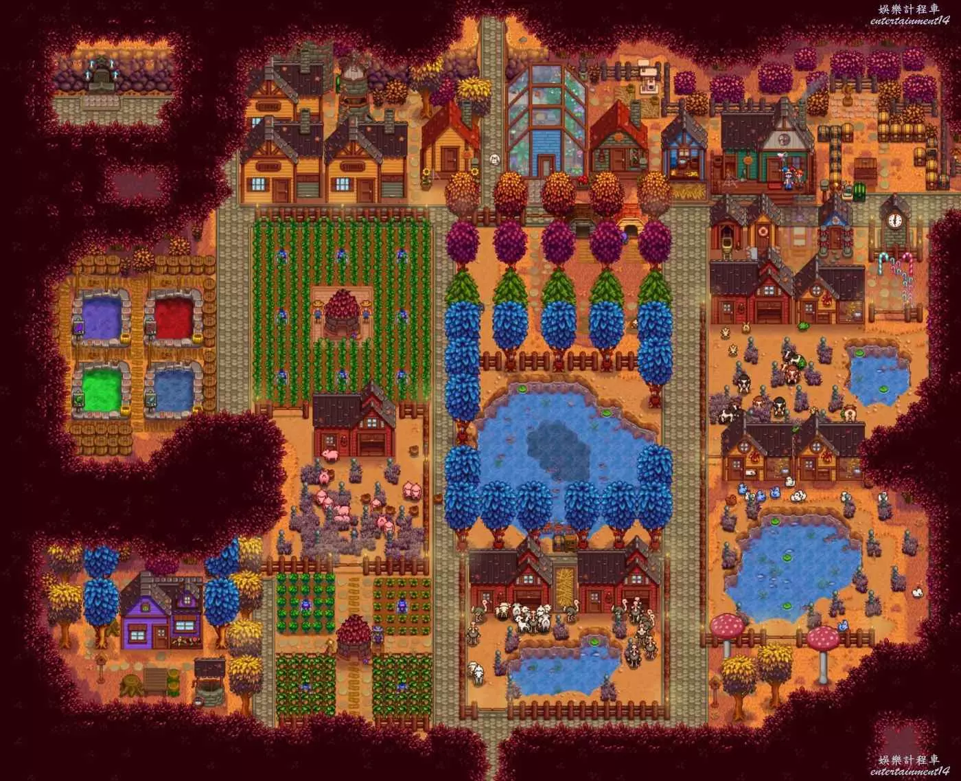 森林農場佈局最難的地方有兩點,第一是地塊比較碎,尤其是西側被森林分成了三塊,草地和泥地排列也不太規整,第二是池塘多,地圖裡還有一些硬木樹樁和灌木叢。解決辦法還是有的,就是把西側天然分出的幾塊區域裝飾一下,比如我這裡是做成了魚塘和史萊姆屋,利用地圖自帶的硬木樹樁當座位,如果覺得硬木不美觀,也可以鋪地板防止硬木刷新,然後用池塘劃分畜棚區域,每個池塘對應一片養殖區。地圖中間草地泥地混合不好看就鋪地板+種樹+養寵物。